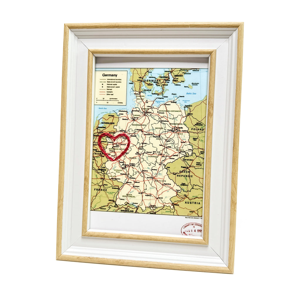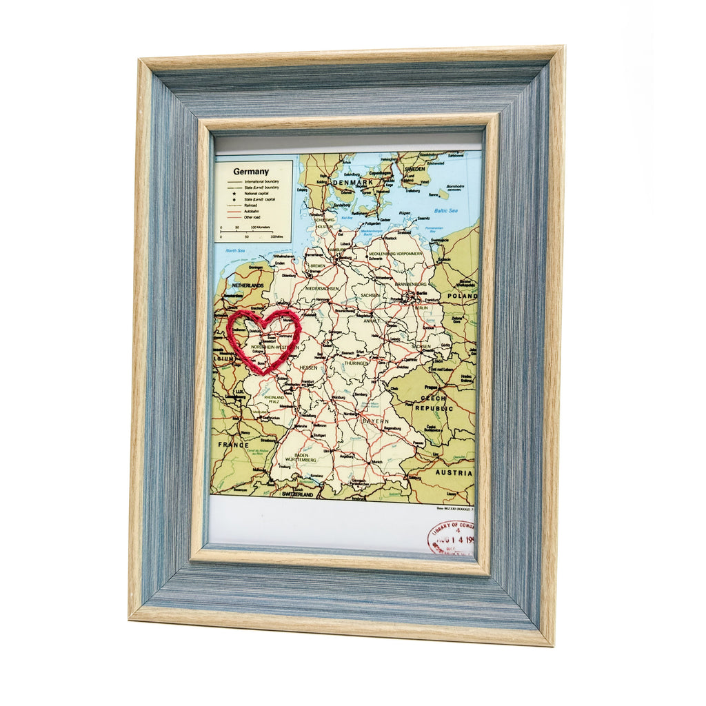 This vintage Germany map print has been hand-embroidered with a red heart around Düsseldorf that symbolizes the places, people, and adventures you hold dear.