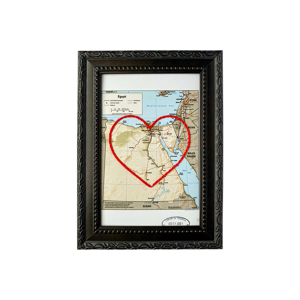 This vintage Egypt map print has been hand-embroidered with a red heart that symbolizes the places, people, and adventures you hold dear.