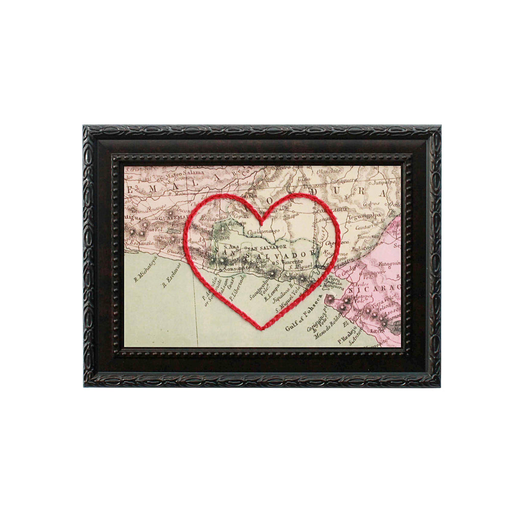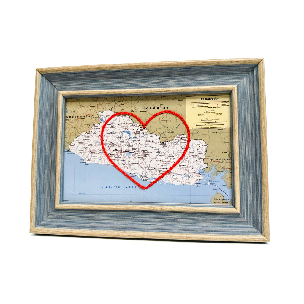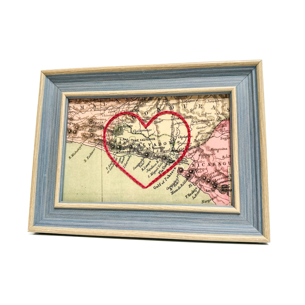 This vintage El Salvador map print has been hand-embroidered with a red heart that symbolizes the places, people, and adventures you hold dear.