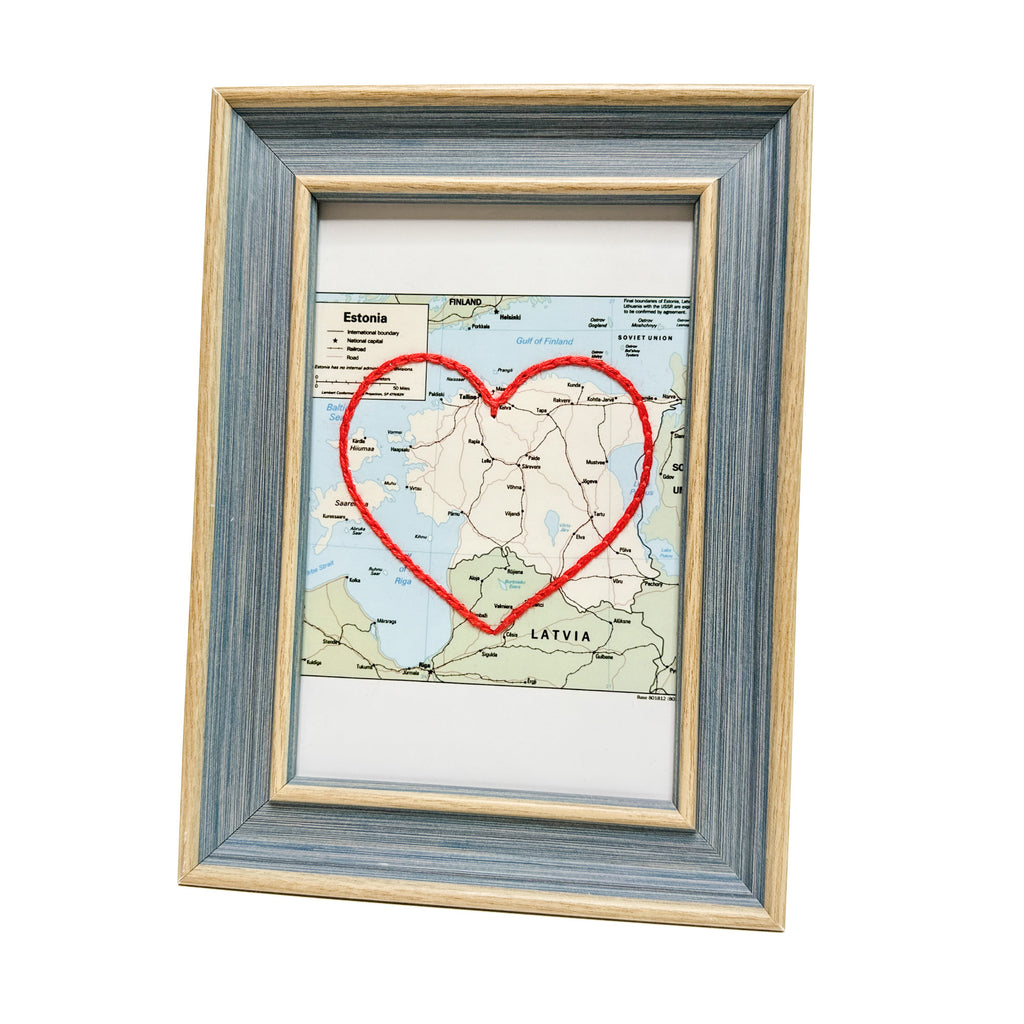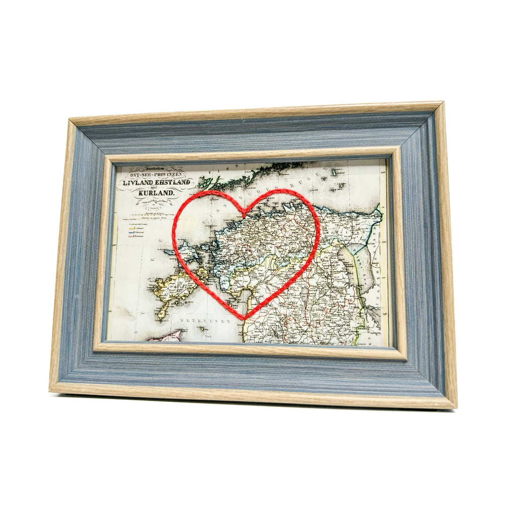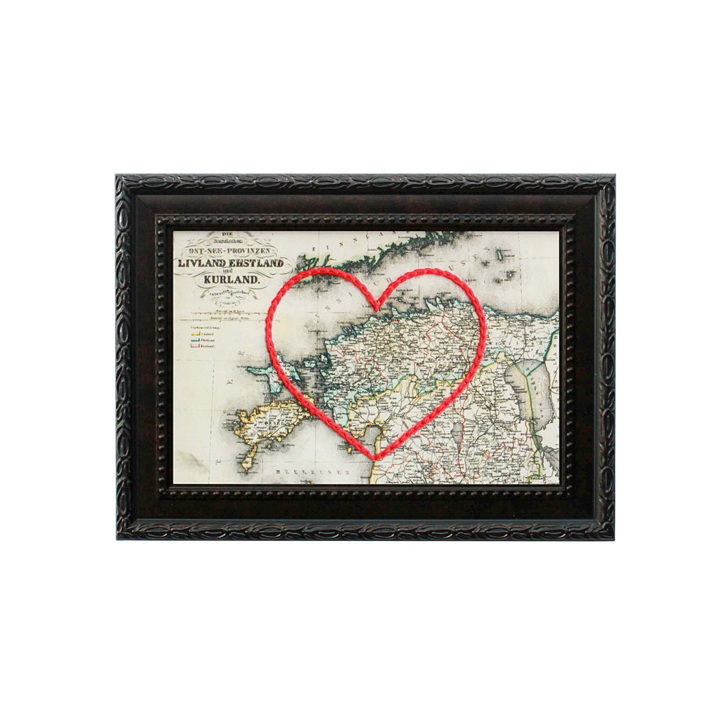 This vintage Estonia map print has been hand-embroidered with a red heart that symbolizes the places, people, and adventures you hold dear.