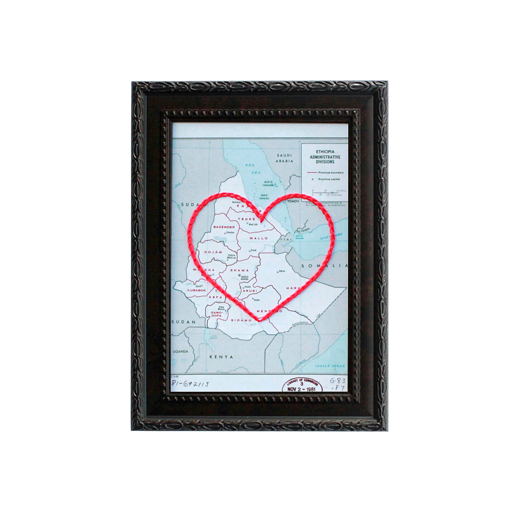 This vintage Ethiopia map print has been hand-embroidered with a red heart that symbolizes the places, people, and adventures you hold dear.