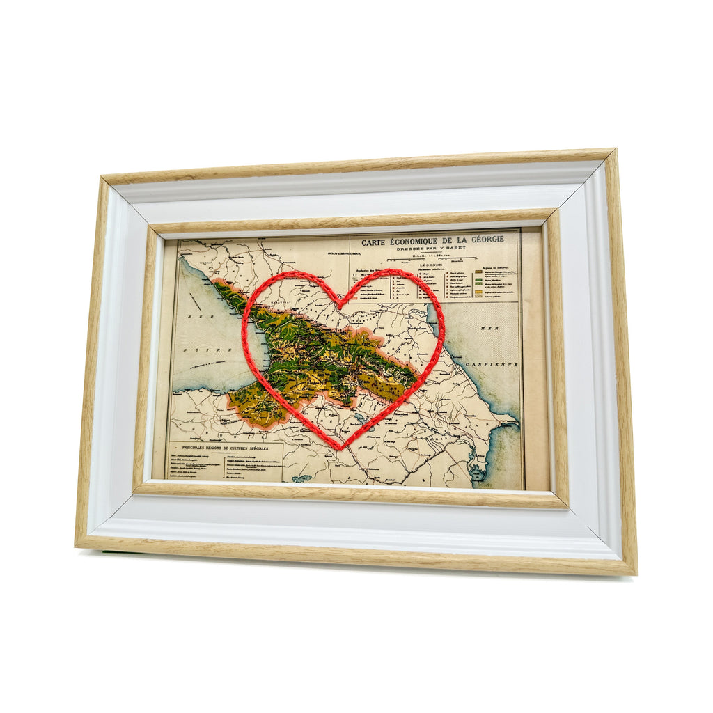 This vintage country of Georgia map print has been hand-embroidered with a red heart that symbolizes the places, people, and adventures you hold dear.