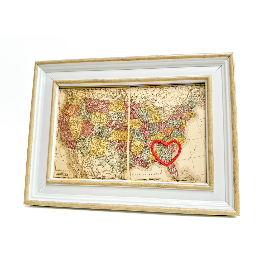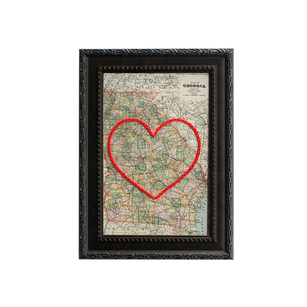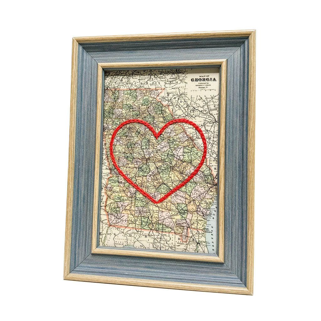 This vintage state of Georgia map print has been hand-embroidered with a red heart that symbolizes the places, people, and adventures you hold dear.