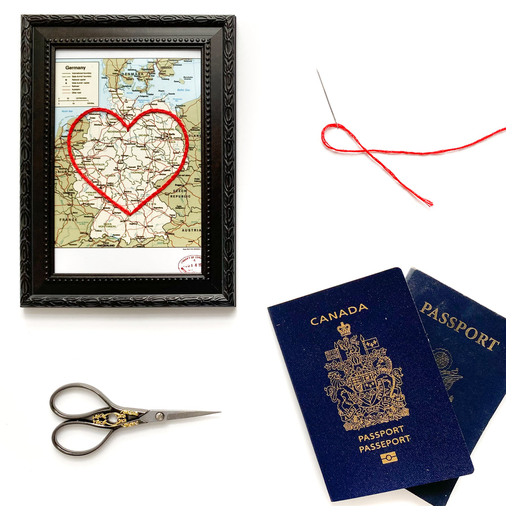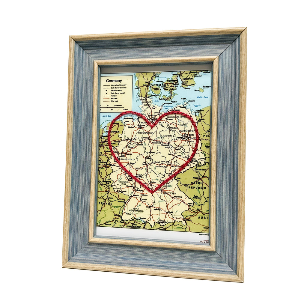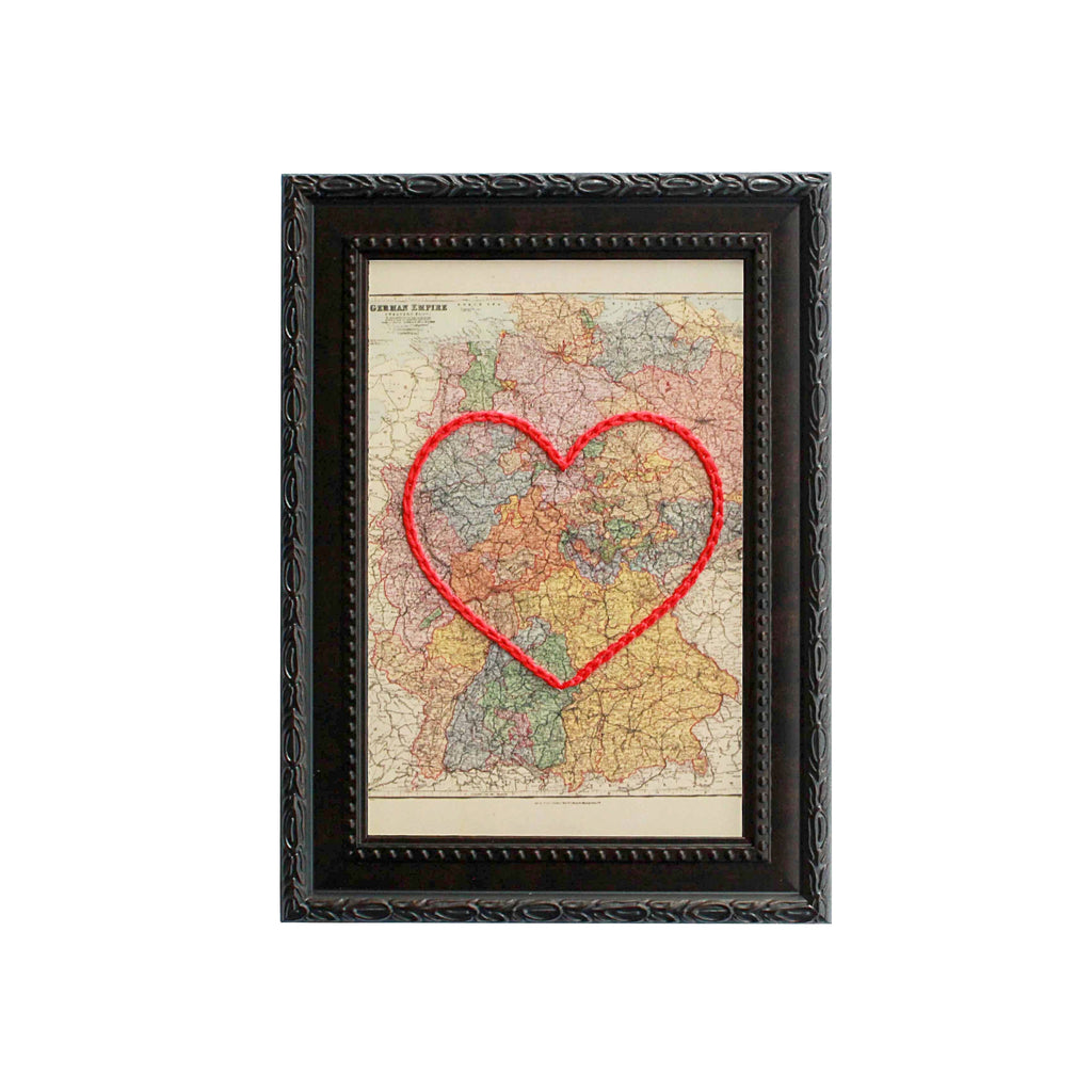 This vintage Germany map print has been hand-embroidered with a red heart that symbolizes the places, people, and adventures you hold dear.