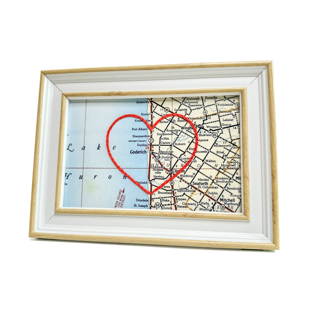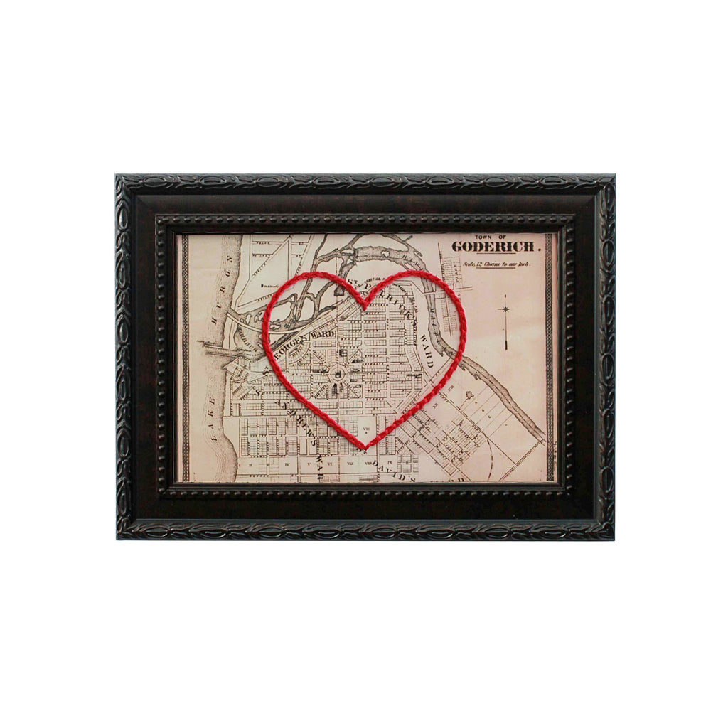This vintage Goderich, Ontario map print has been hand-embroidered with a red heart that symbolizes the places, people, and adventures you hold dear.