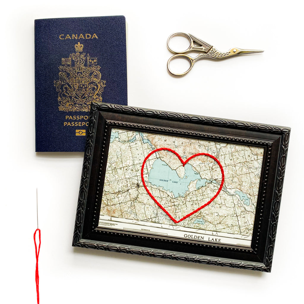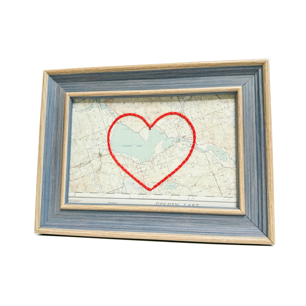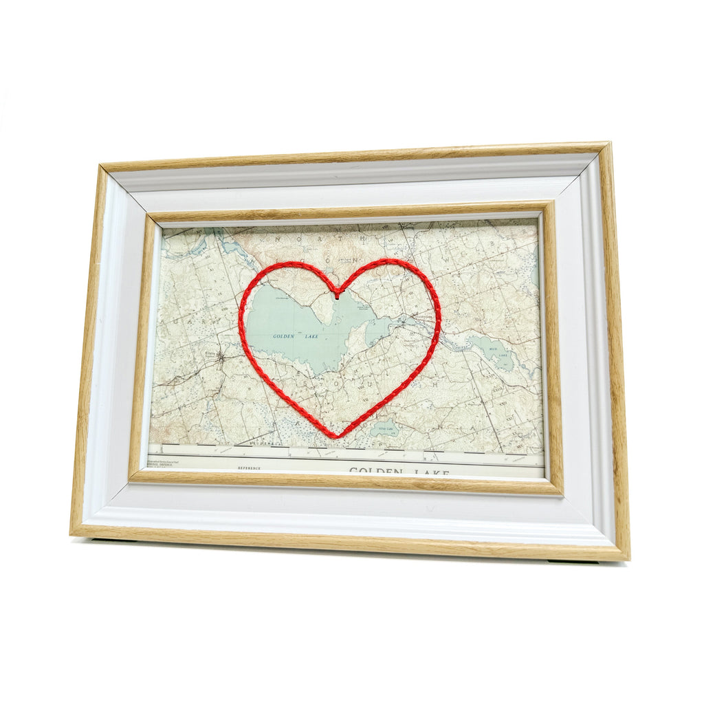 This vintage Golden Lake, Ontario map print has been hand-embroidered with a red heart that symbolizes the places, people, and adventures you hold dear.