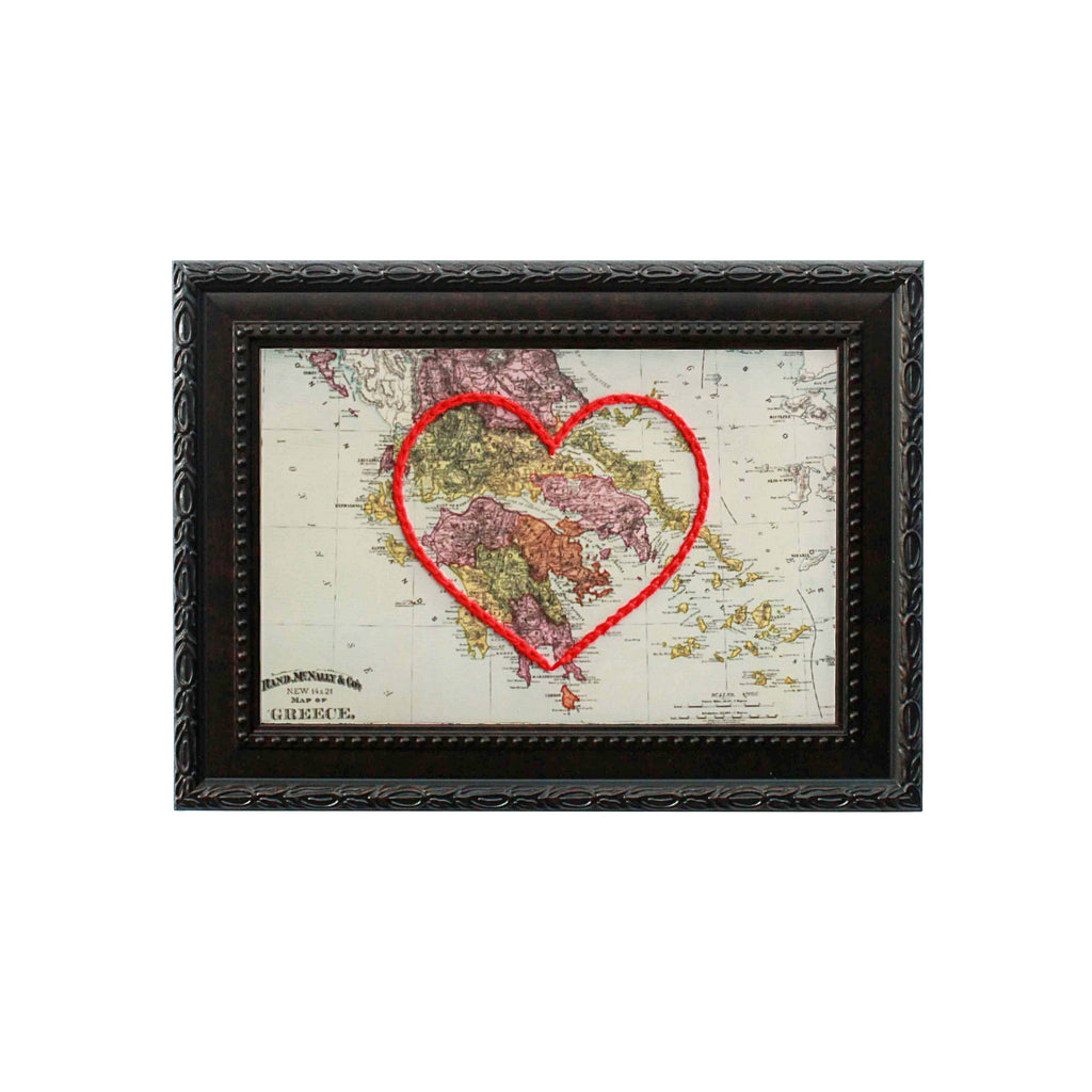 This vintage Greece map print has been hand-embroidered with a red heart that symbolizes the places, people, and adventures you hold dear.