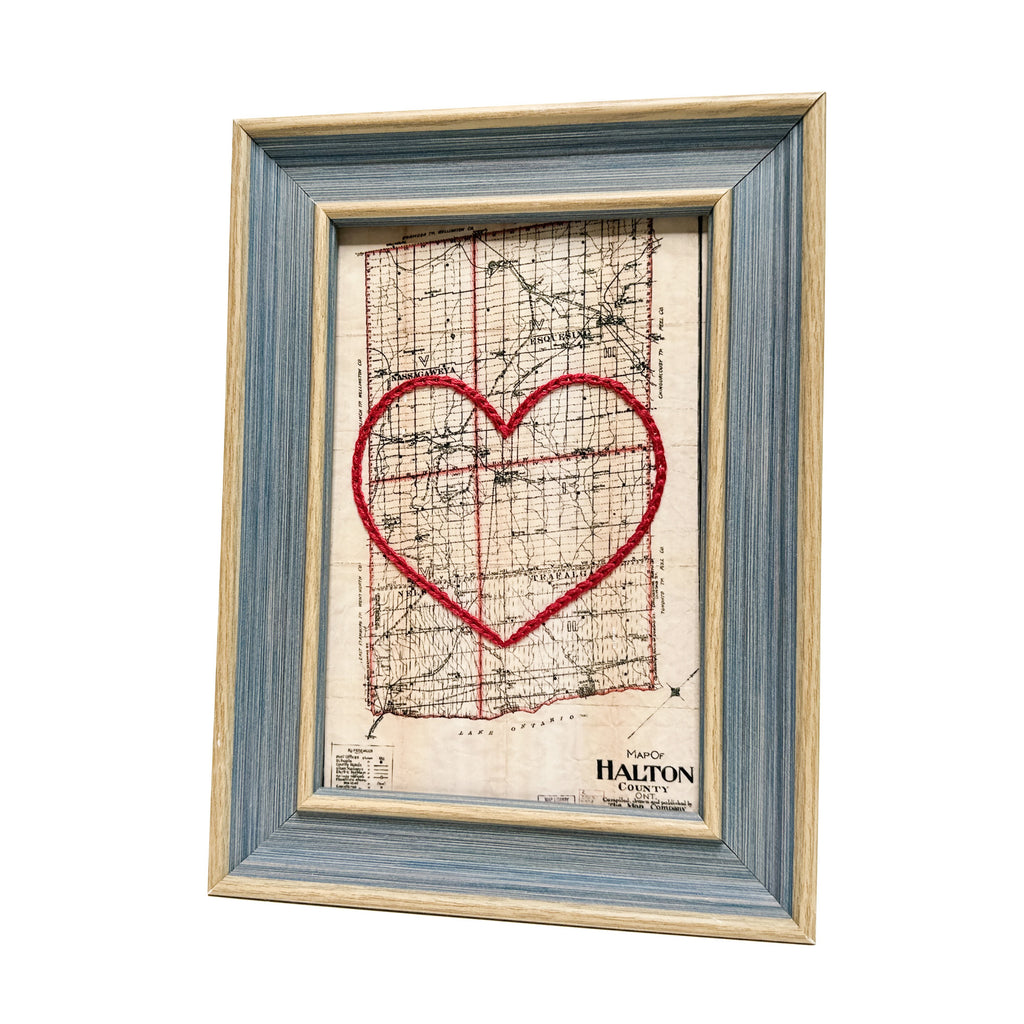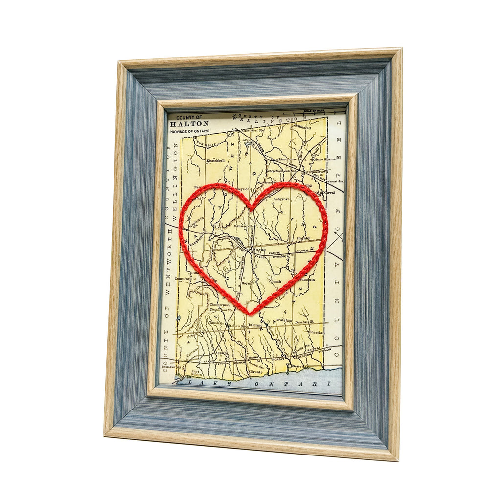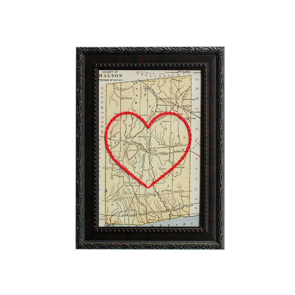 This vintage Halton County, Ontario map print has been hand-embroidered with a red heart that symbolizes the places, people, and adventures you hold dear.