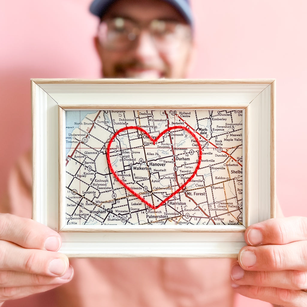 This vintage Hanover, Ontario map print has been hand-embroidered with a red heart to symbolize the places, people, and adventures you hold dear.