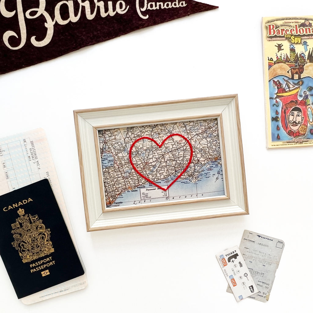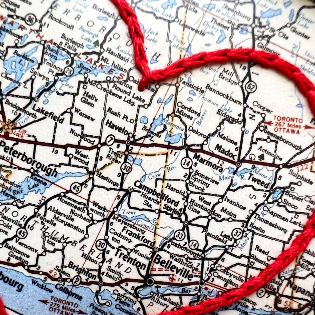 This vintage Hastings, Ontario map print has been hand-embroidered with a red heart to symbolize the places, people, and adventures you hold dear.
