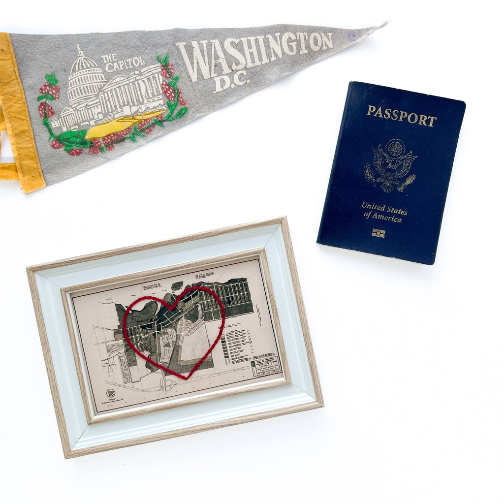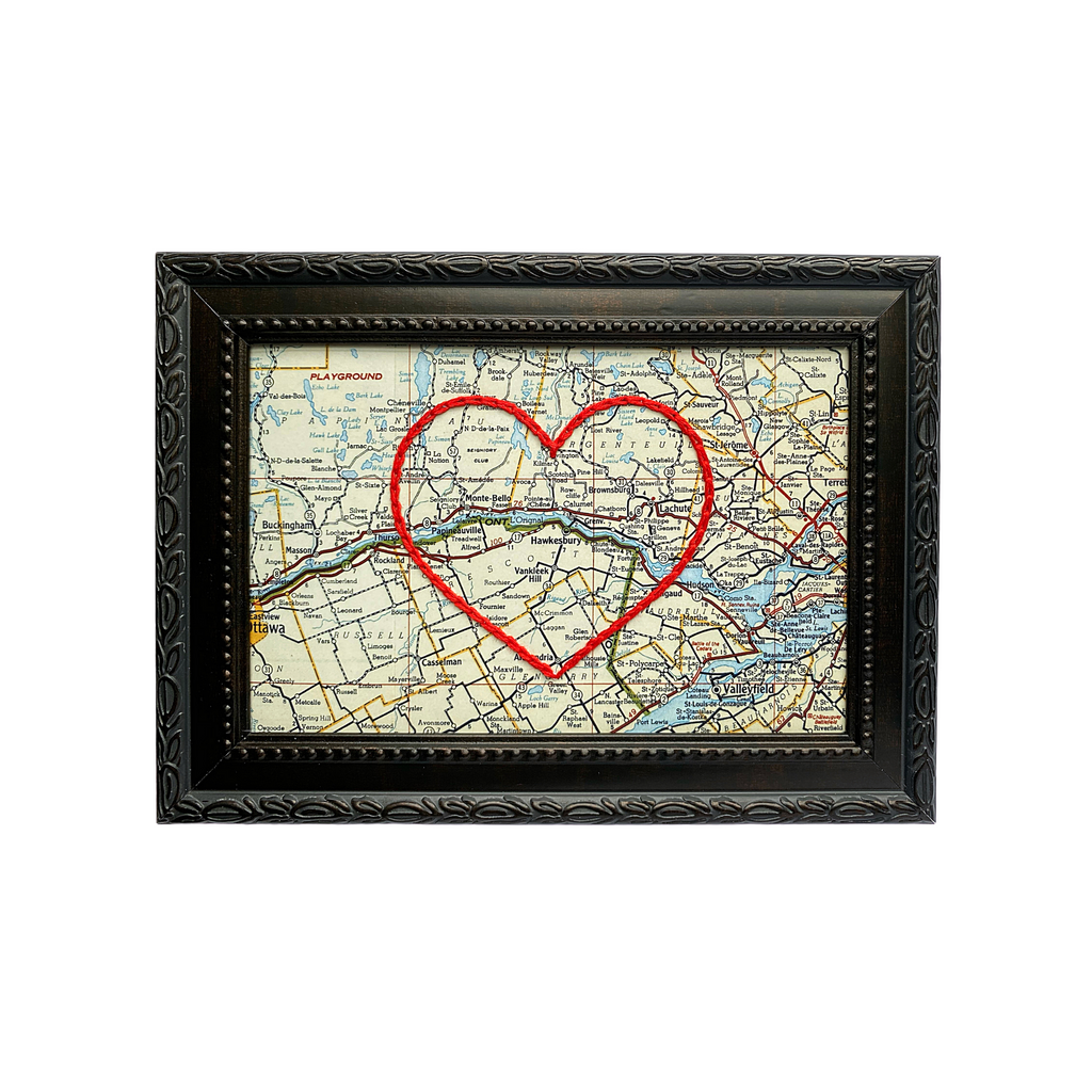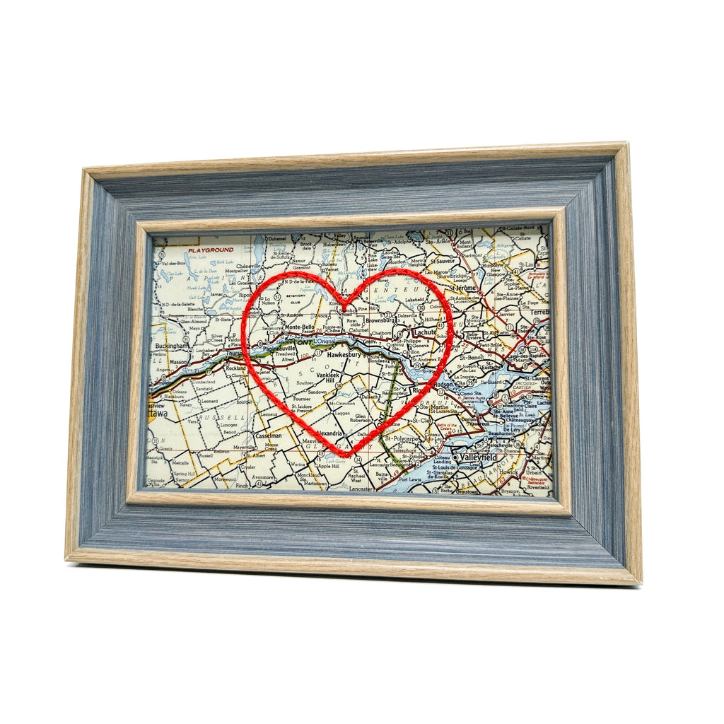 This vintage Hawkesbury, Ontario map print has been hand-embroidered with a red heart to symbolize the places, people, and adventures you hold dear.