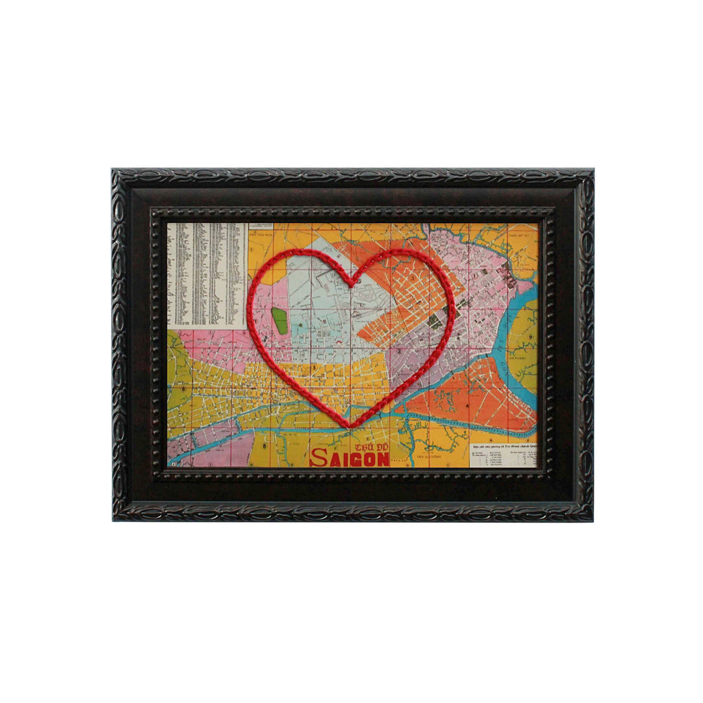 This vintage Ho Chi Minh City, Vietnam map print has been hand-embroidered with a red heart to symbolize the places, people, and adventures you hold dear.
