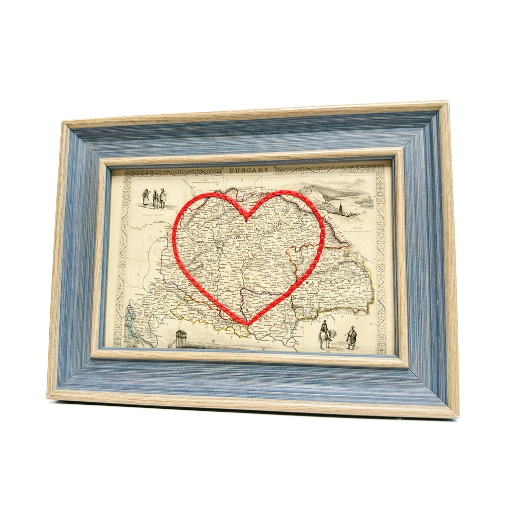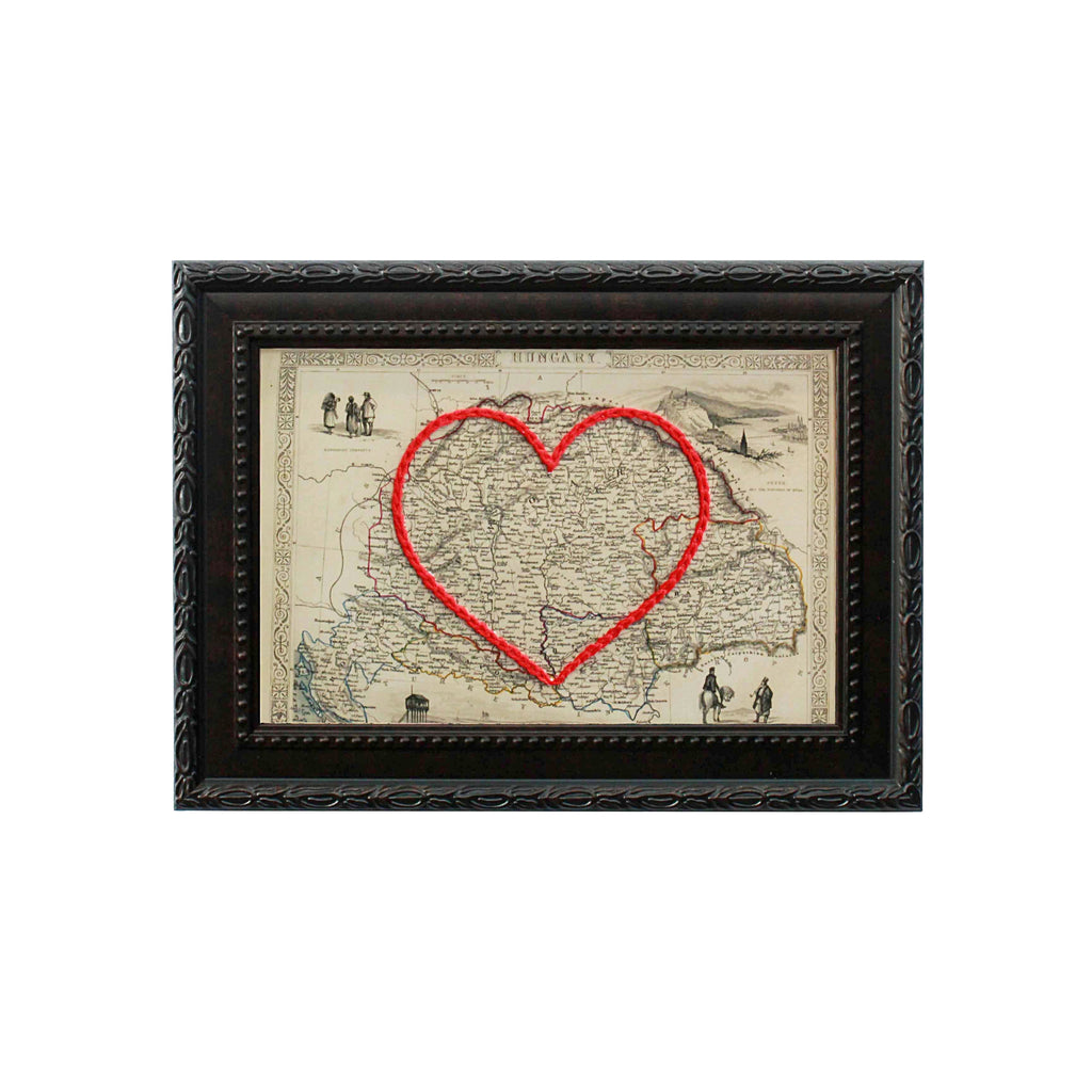 This vintage Hungary map print has been hand-embroidered with a red heart to symbolize the places, people, and adventures you hold dear.