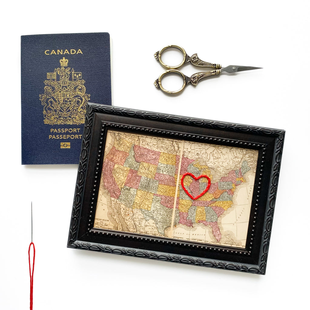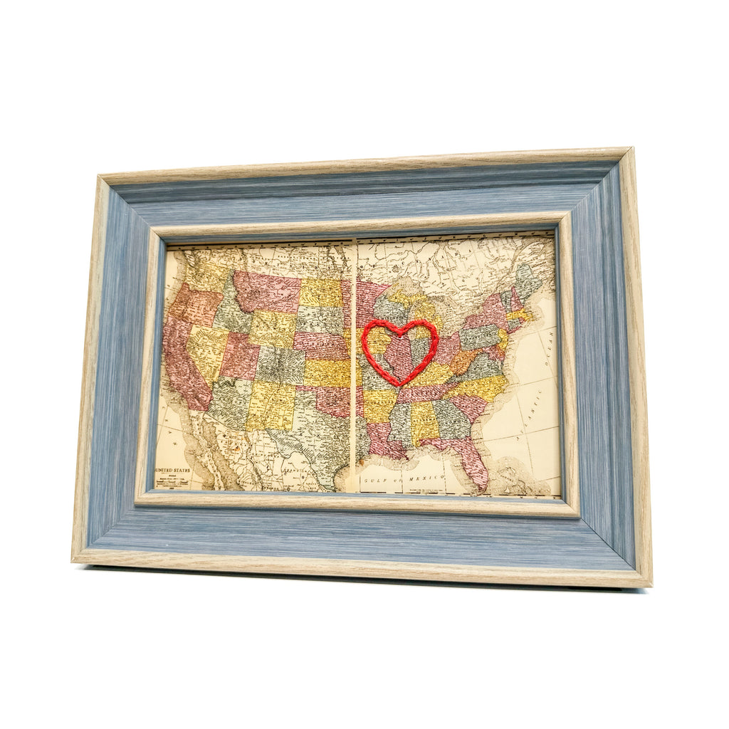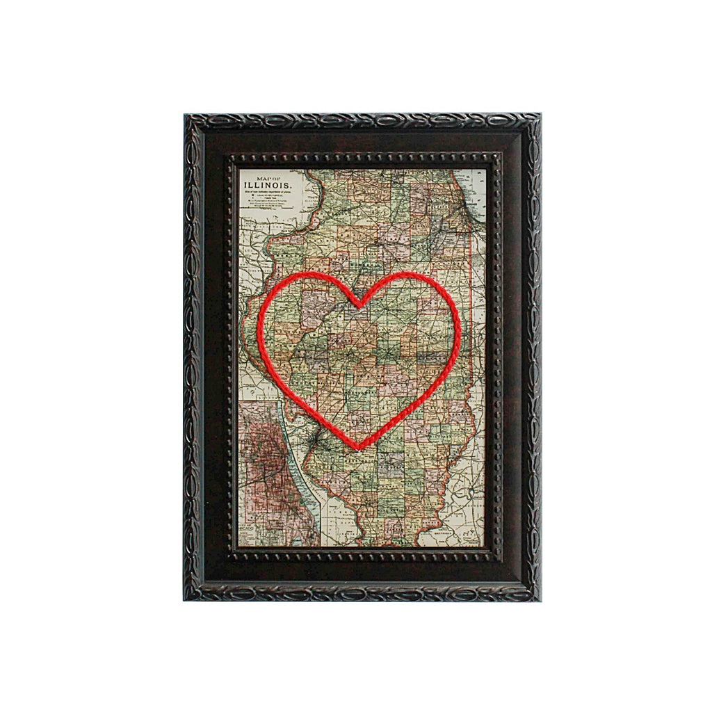This vintage Illinois map print has been hand-embroidered with a red heart to symbolize the places, people, and adventures you hold dear.