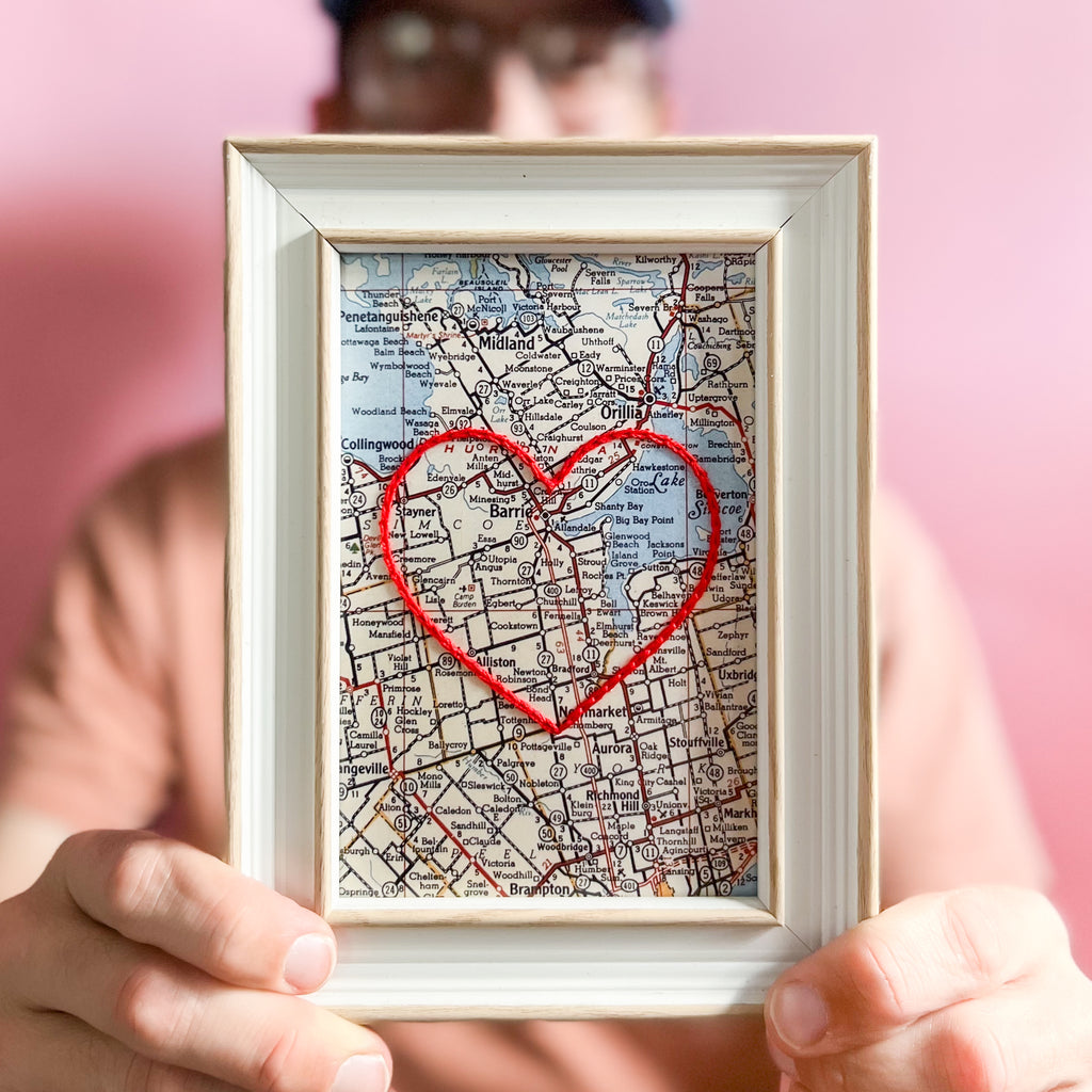 This vintage Innisfil, Ontario map print has been hand-embroidered with a red heart to symbolize the places, people, and adventures you hold dear.