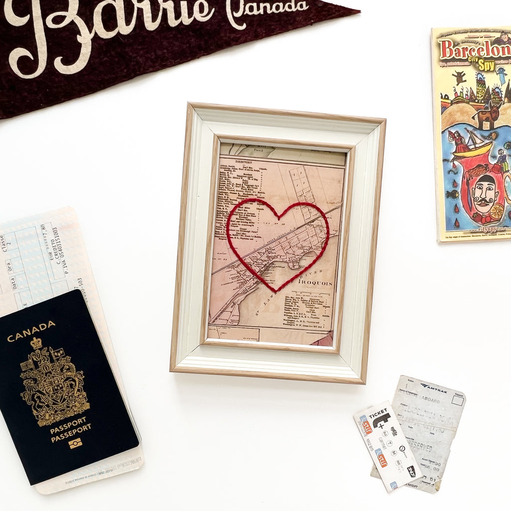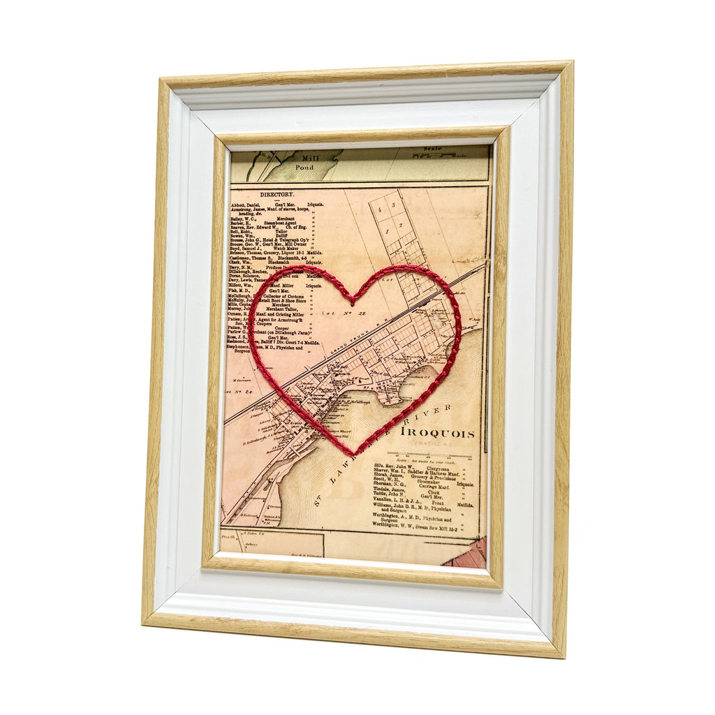 This vintage Iroquois, Ontario map print has been hand-embroidered with a red heart that symbolizes the places, people, and adventures you hold dear.