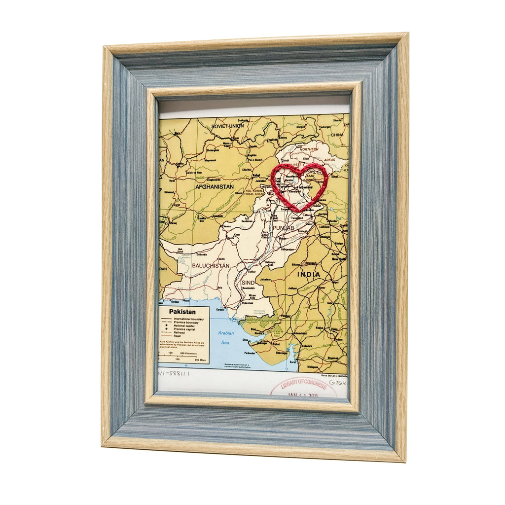 This vintage Pakistan map print has been hand-embroidered with a red heart around Islamabad - symbolizing the places, people, and adventures you hold dear.