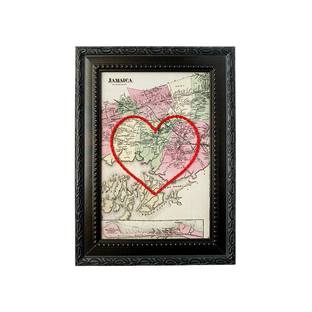 This vintage Jamaica, Queens map print has been hand-embroidered with a red heart that symbolizes the places, people, and adventures you hold dear.