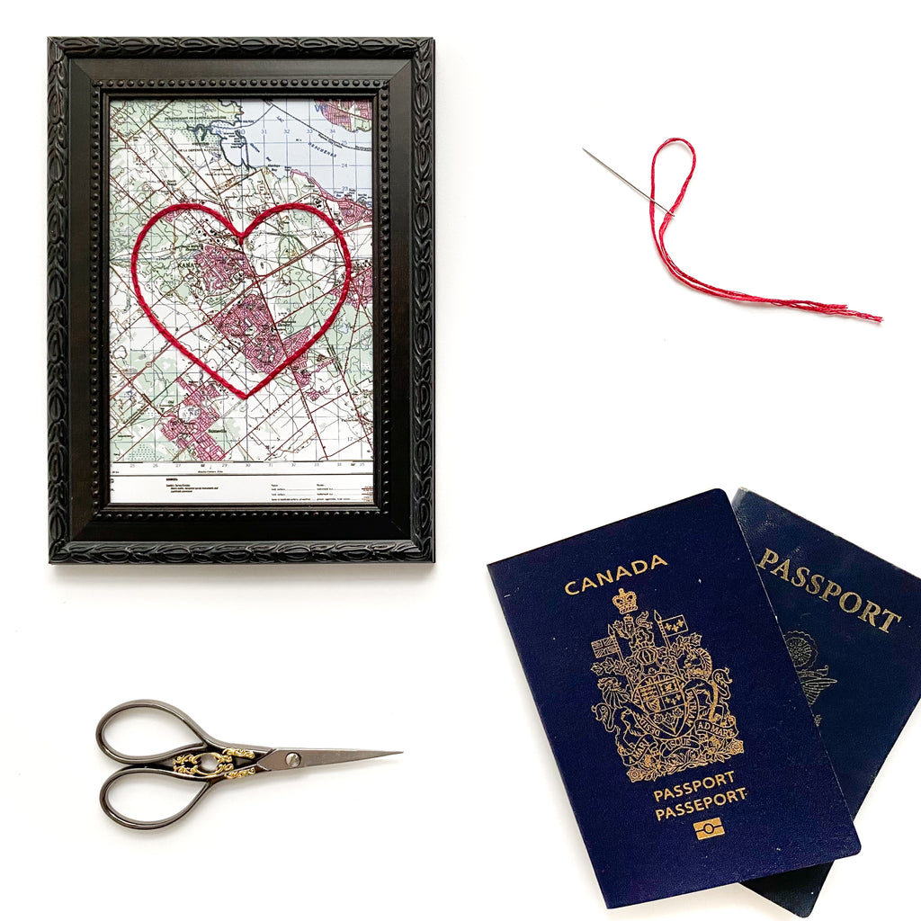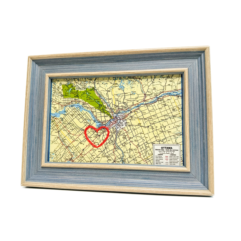 This vintage Kanata, Ottawa map print has been hand-embroidered with a red heart to symbolize the places, people, and adventures you hold dear.