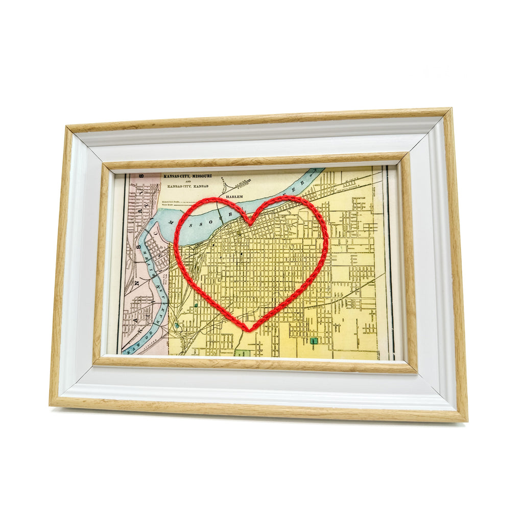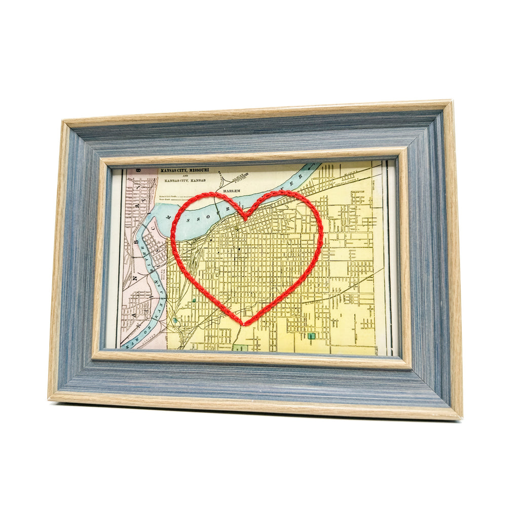 This vintage Kansas City, Missouri map print has been hand-embroidered with a red heart to symbolize the places, people, and adventures you hold dear.