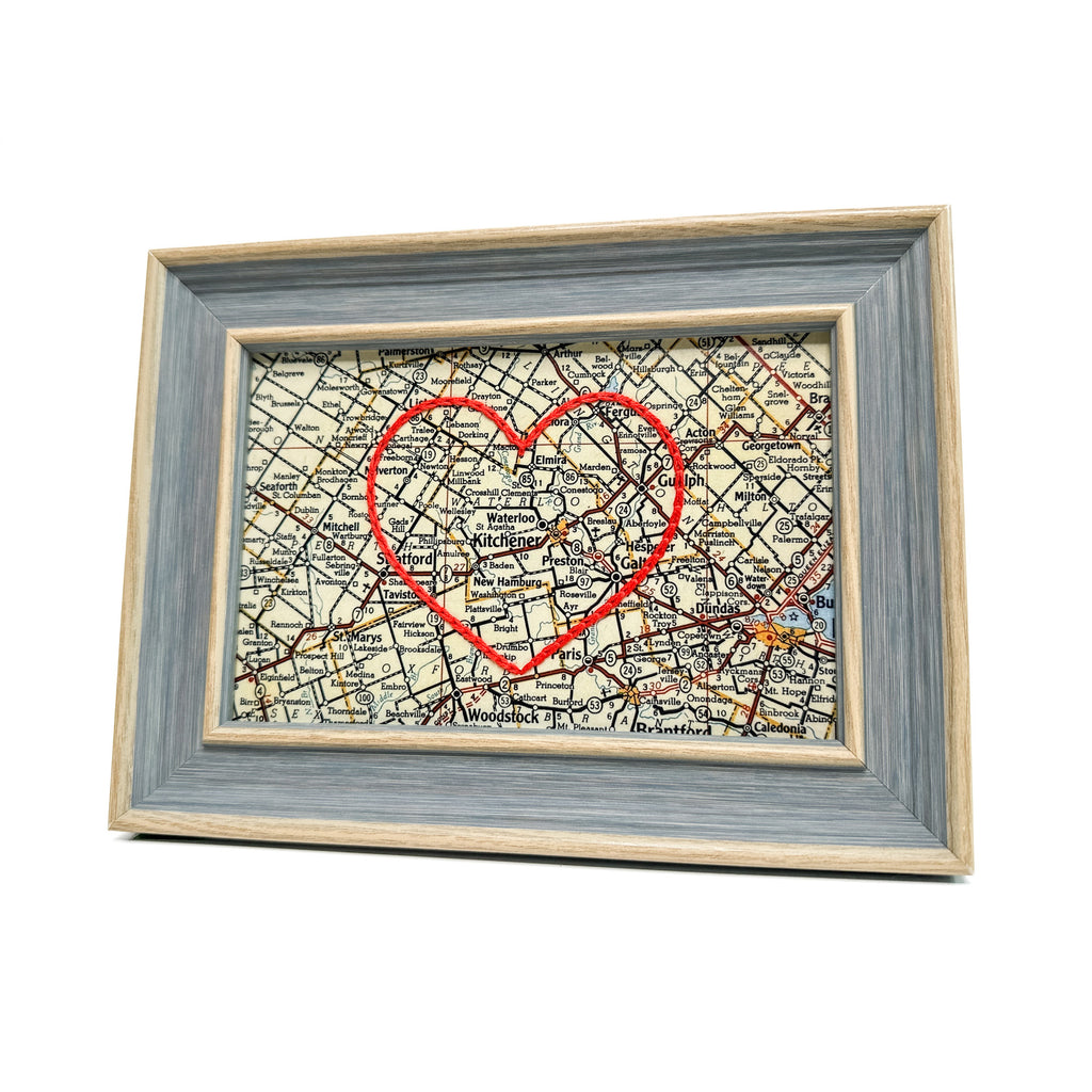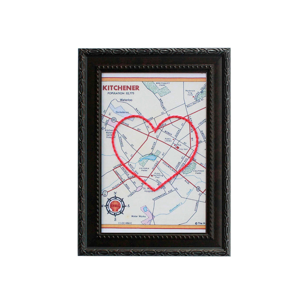 This vintage Kitchener, Ontario map print has been hand-embroidered with a red heart that symbolizes the places, people, and adventures you hold dear.