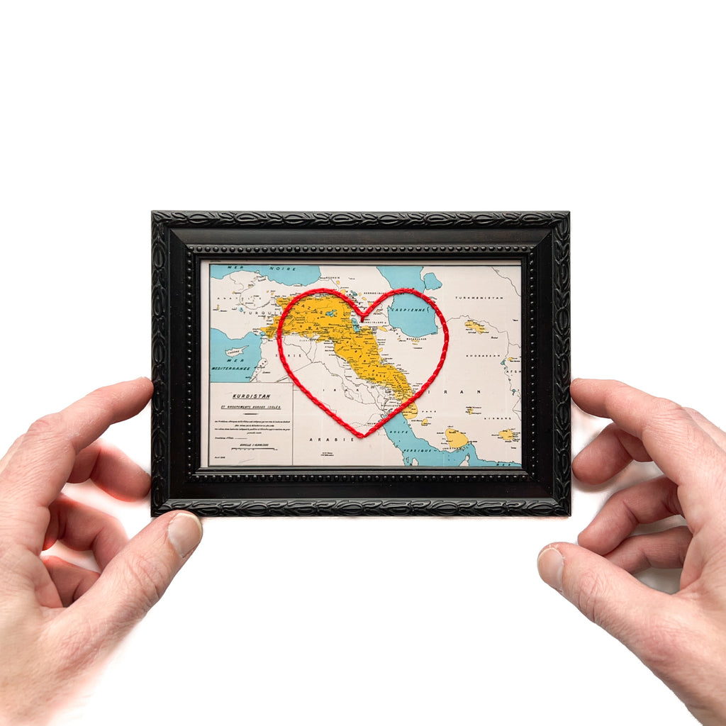 This vintage Kurdistan map print has been hand-embroidered with a red heart that symbolizes the places, people, and adventures you hold dear.