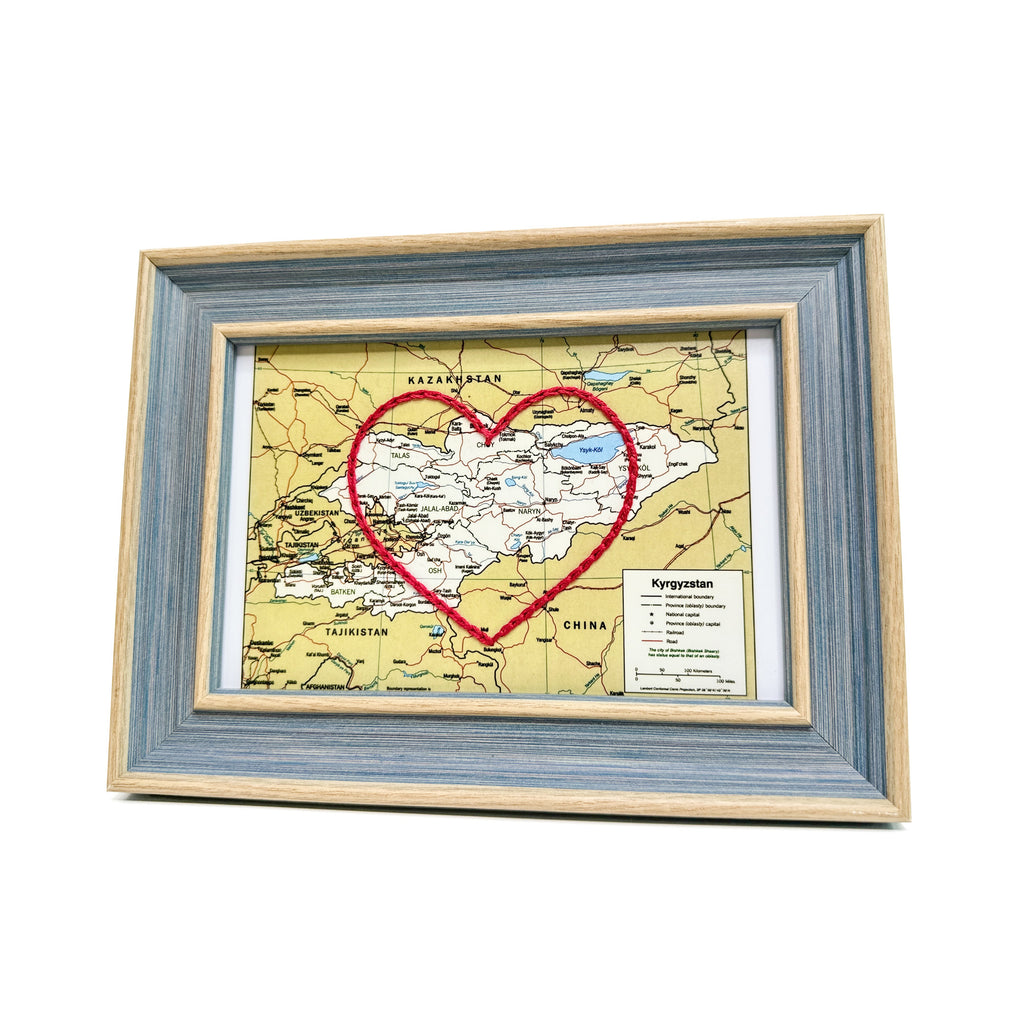 This vintage Kyrgyzstan map print has been hand-embroidered with a red heart that symbolizes the places, people, and adventures you hold dear.