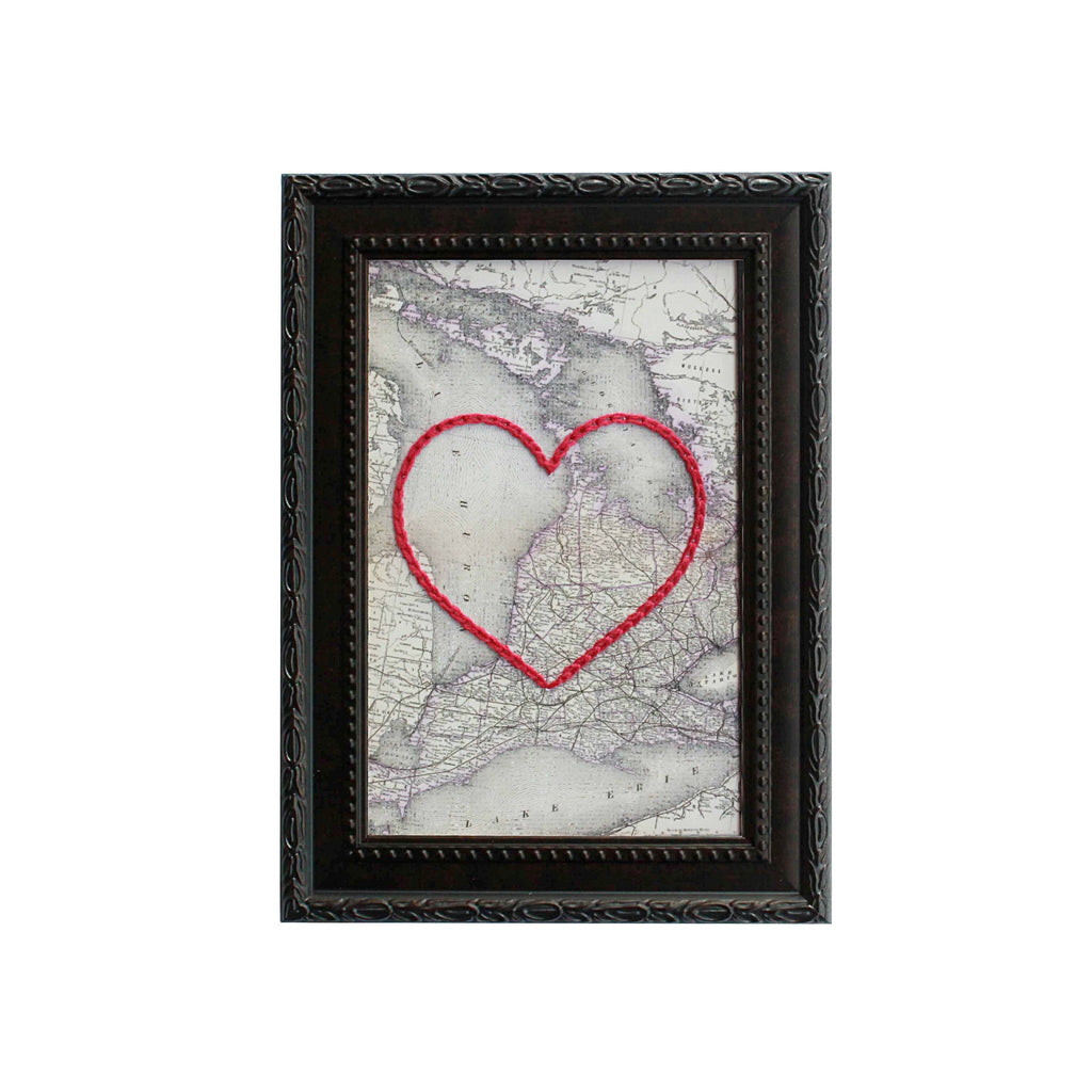 This vintage Lake Huron, Ontario map print has been hand-embroidered with a red heart that symbolizes the places, people, and adventures you hold dear.