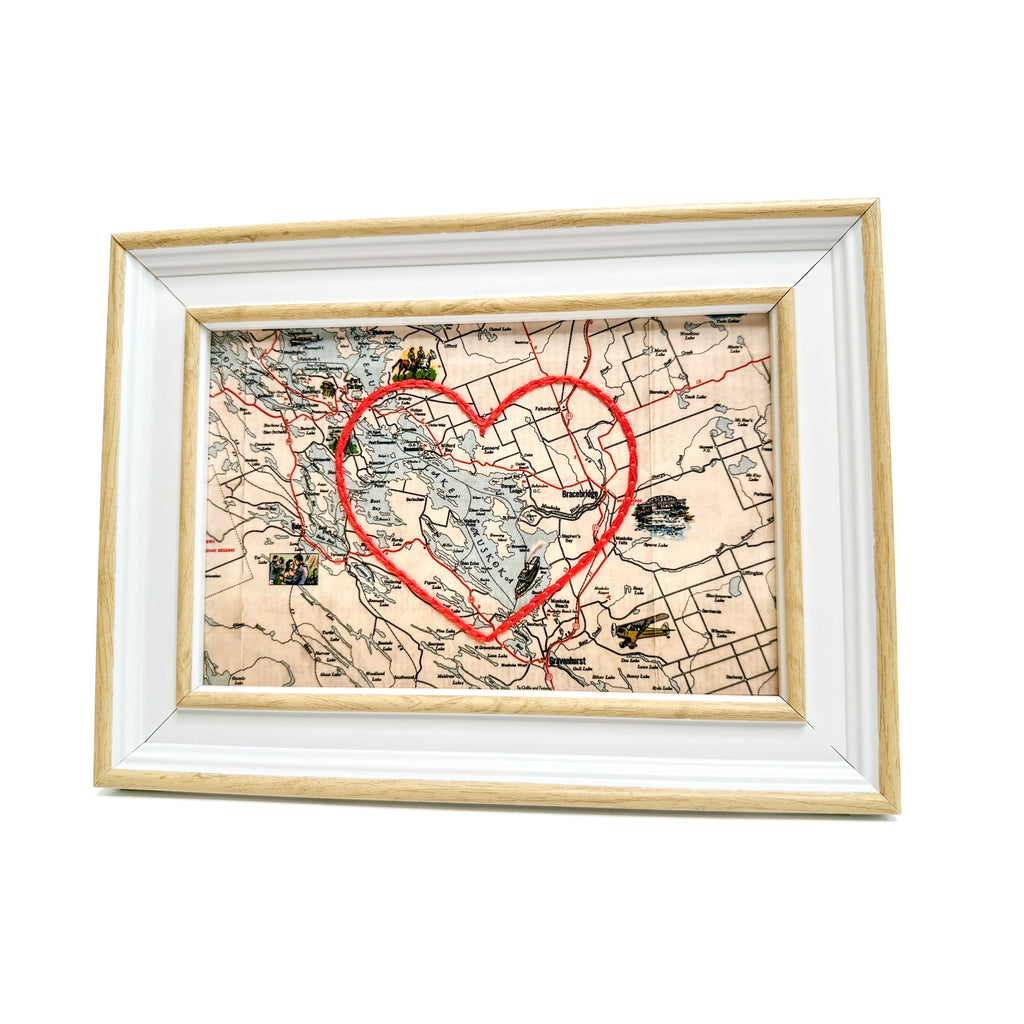 This vintage Lake Muskoka, Ontario map print has been hand-embroidered with a red heart that symbolizes the places, people, and adventures you hold dear.