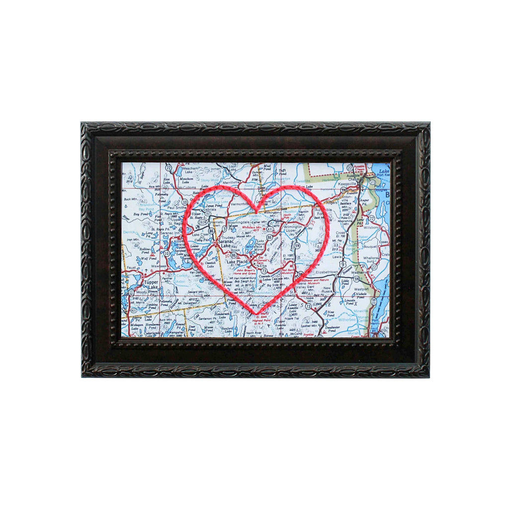 Framed and Ready to Gift: Our Lake Placid Heart Map is framed for your convenience in a complimentary vintage-inspired frame! See product photos for options. All frames can be hung or displayed on a wall or shelf - whichever suits the owner best (except 11x14 frames - which can only be hung).