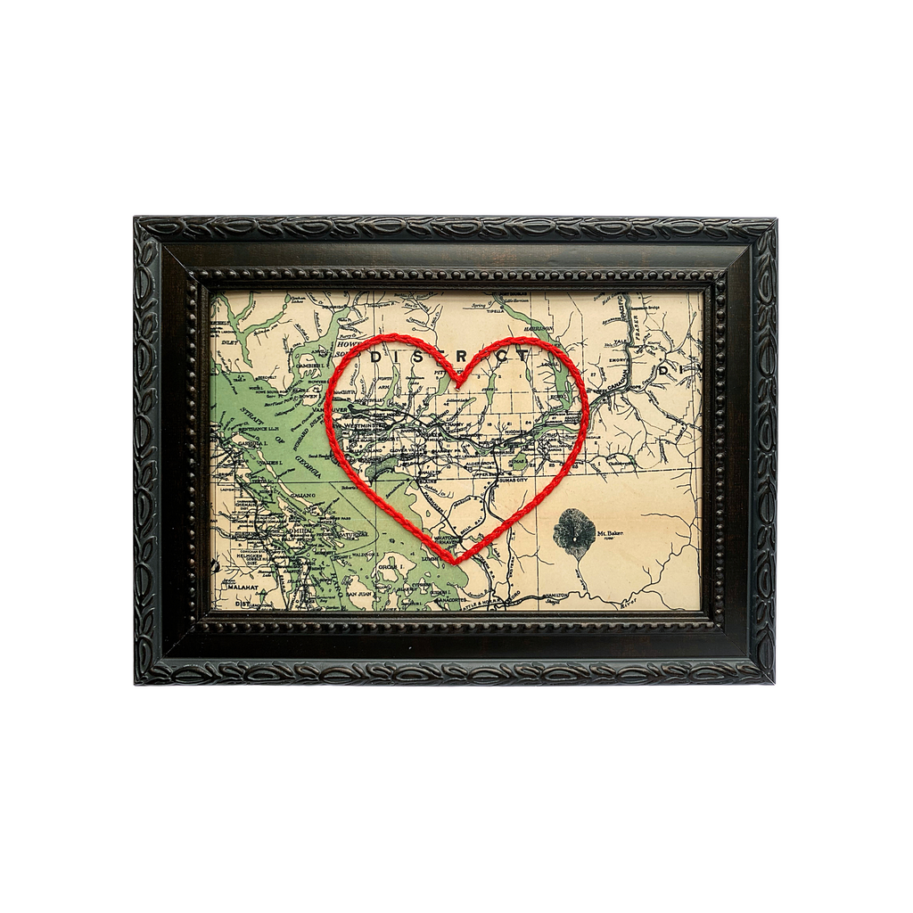 This vintage Langley, British Columbia map print has been hand-embroidered with a red heart that symbolizes the places, people, and adventures you hold dear.