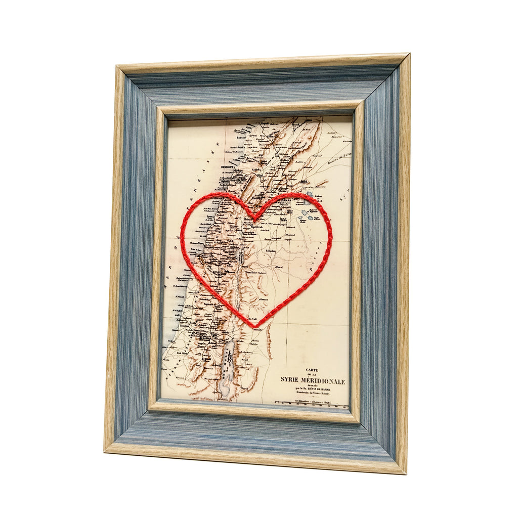 This vintage Lebanon and Palestine map print has been hand-embroidered with a red heart that symbolizes the places, people, and adventures you hold dear.