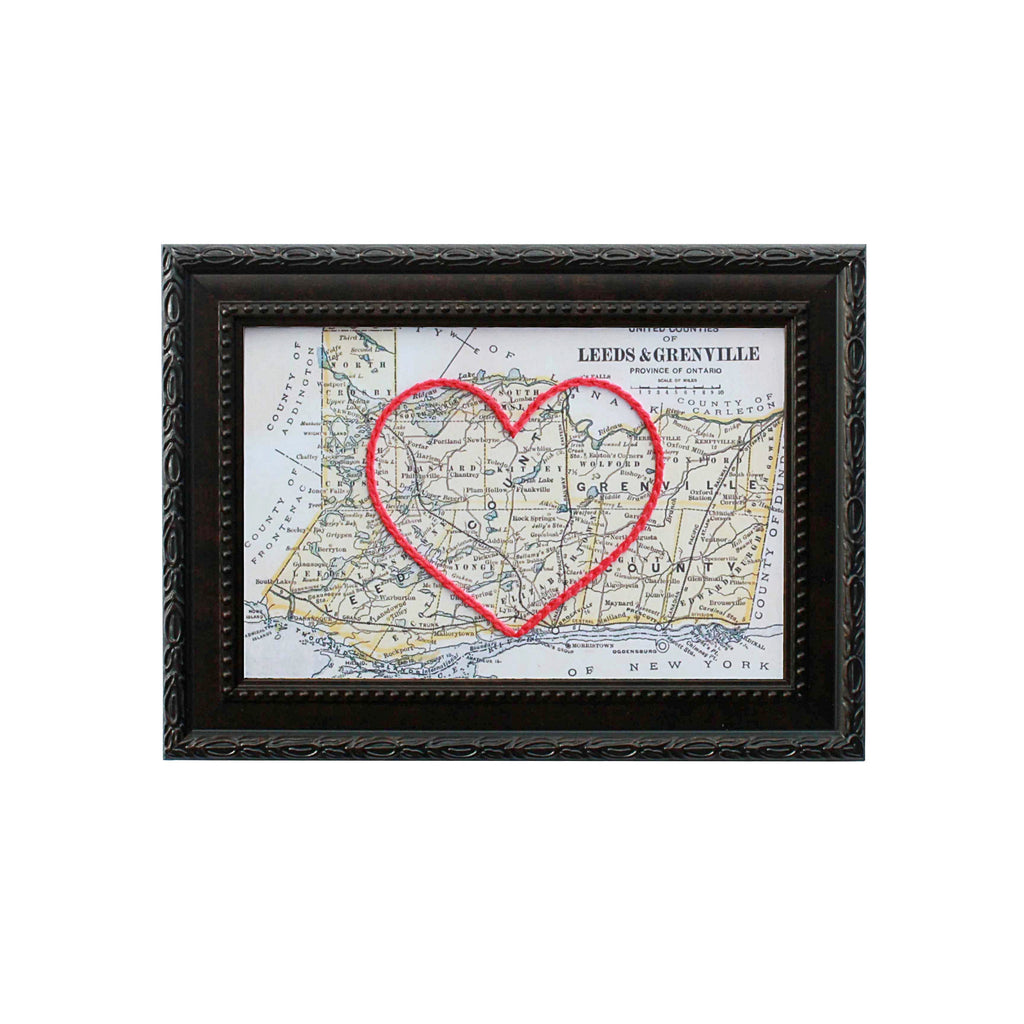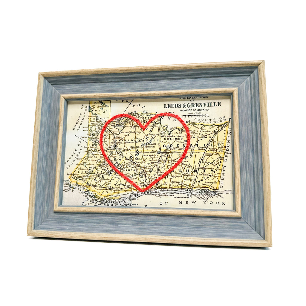 This vintage Leeds and Grenville County, Ontario map print has been hand-embroidered with a red heart that symbolizes the places, people, and adventures you hold dear.