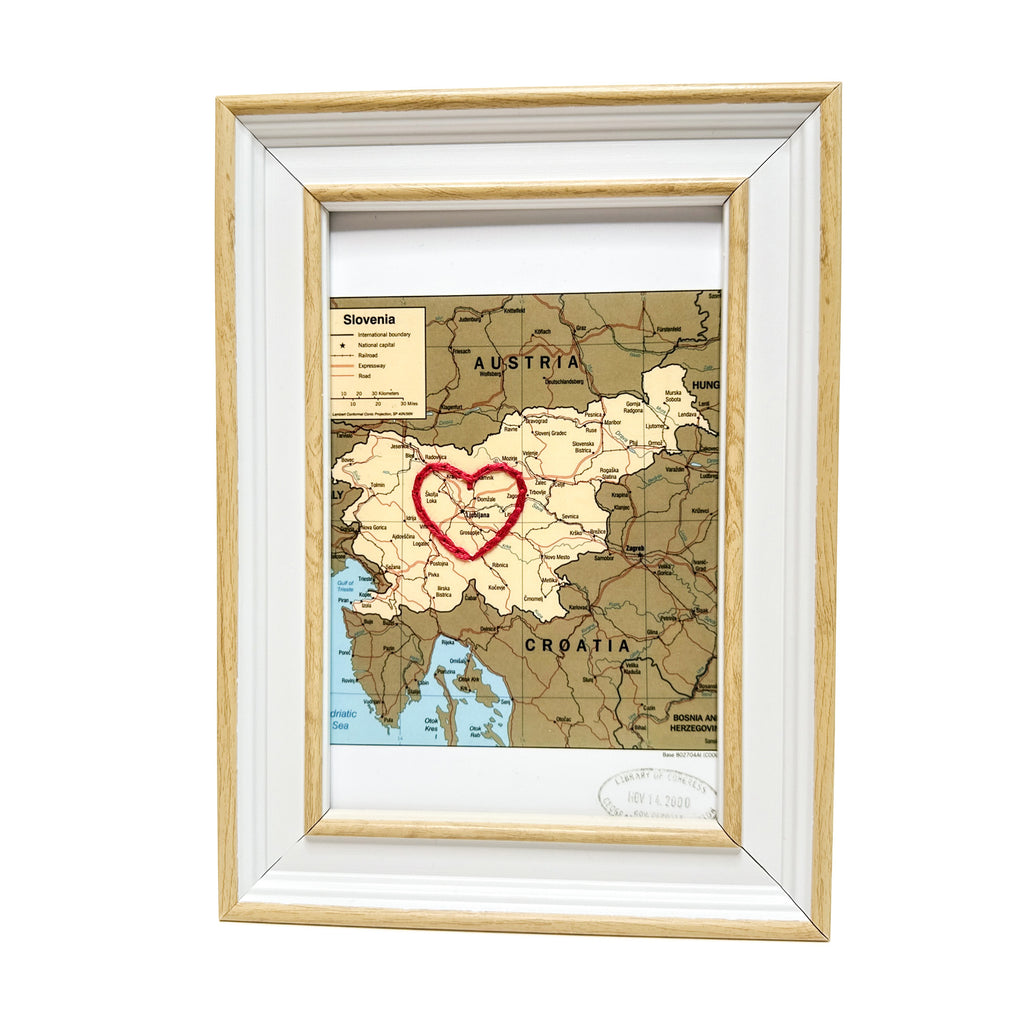 This vintage Slovenia map print has been hand-embroidered with a red heart around Ljubljana - symbolizing the places, people, and adventures you hold dear.