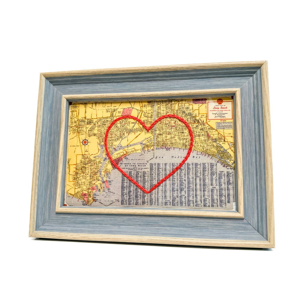 This vintage Long Beach, California map print has been hand-embroidered with a red heart that symbolizes the places, people, and adventures you hold dear.