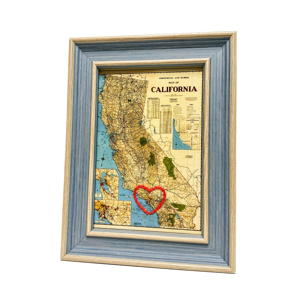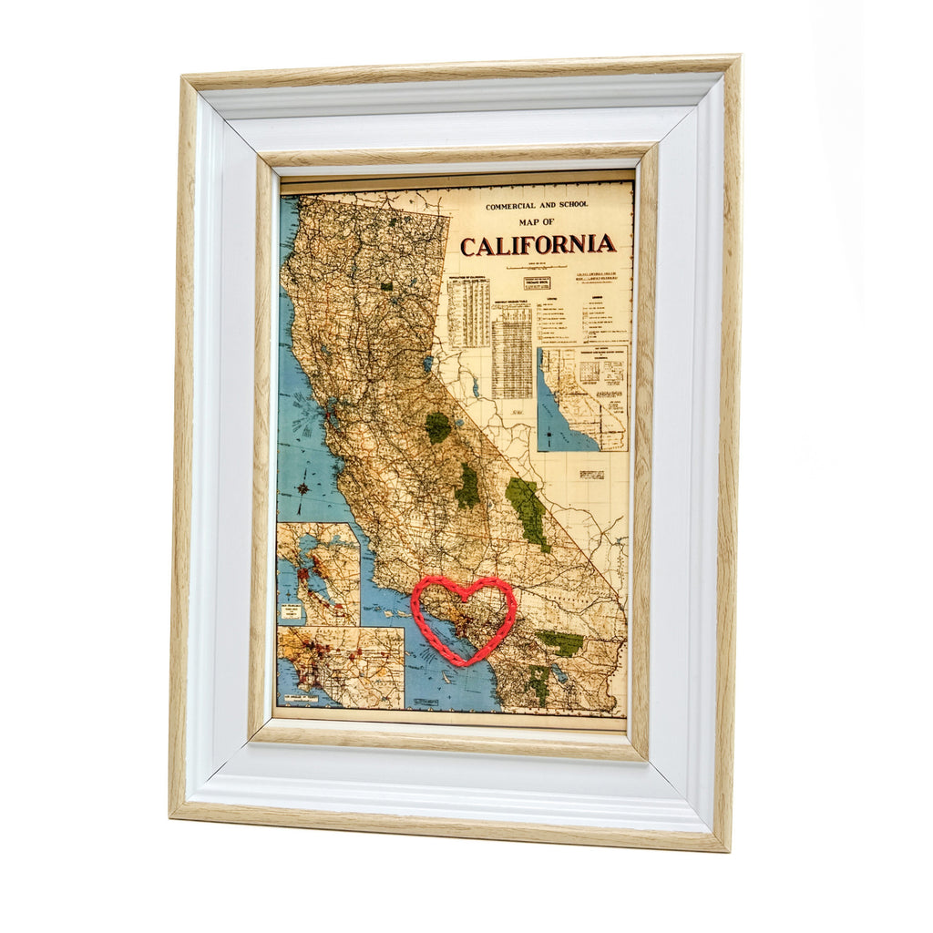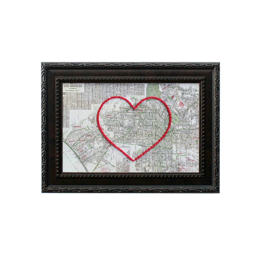 This vintage Los Angeles, California map print has been hand-embroidered with a red heart that symbolizes the places, people, and adventures you hold dear.