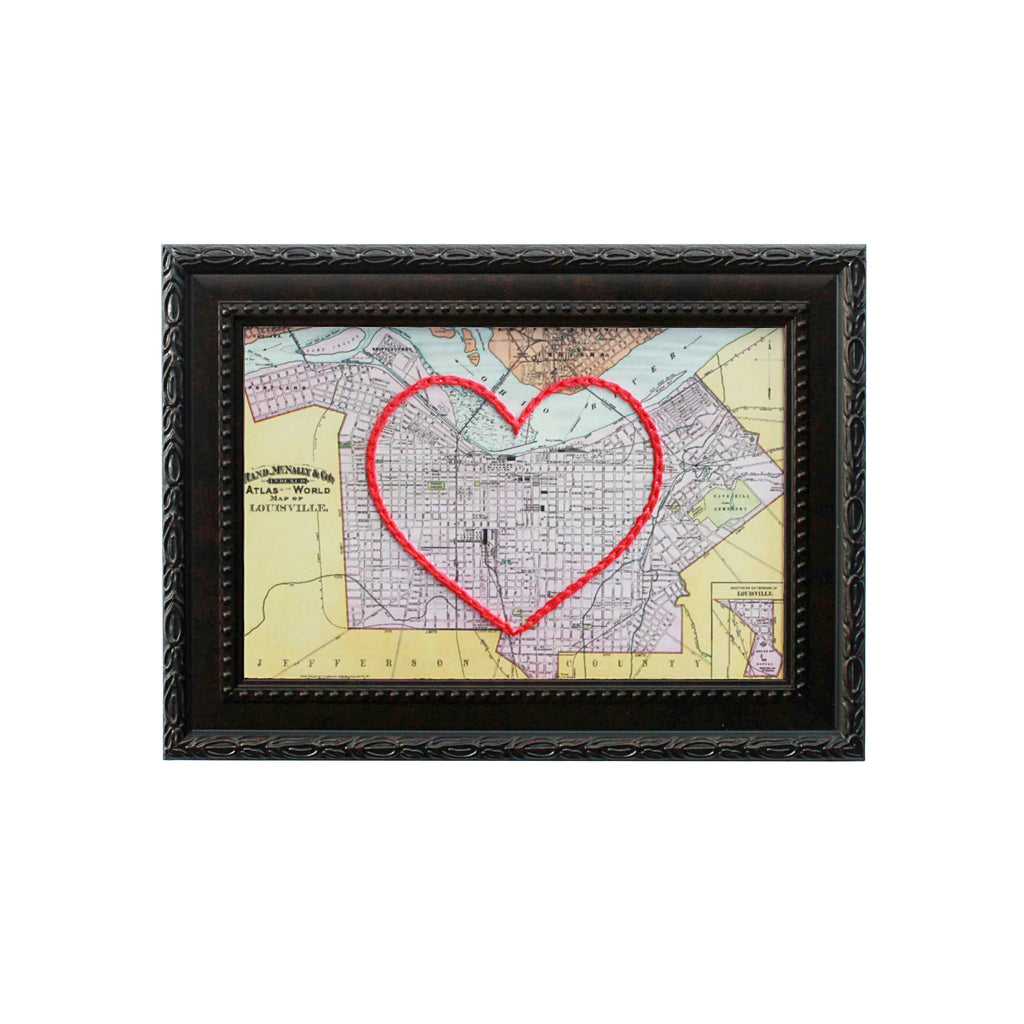 This vintage Louisville, Kentucky map print has been hand-embroidered with a red heart that symbolizes the places, people, and adventures you hold dear.