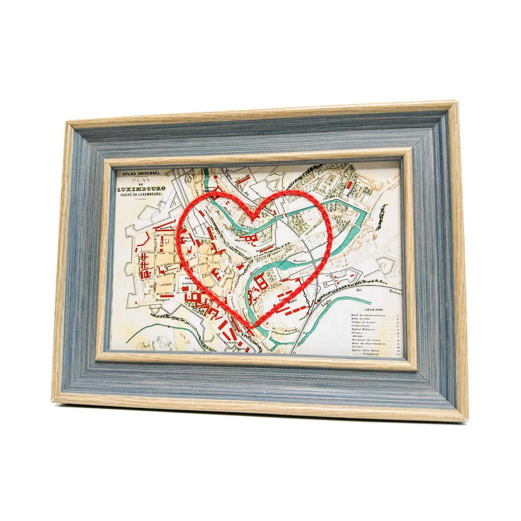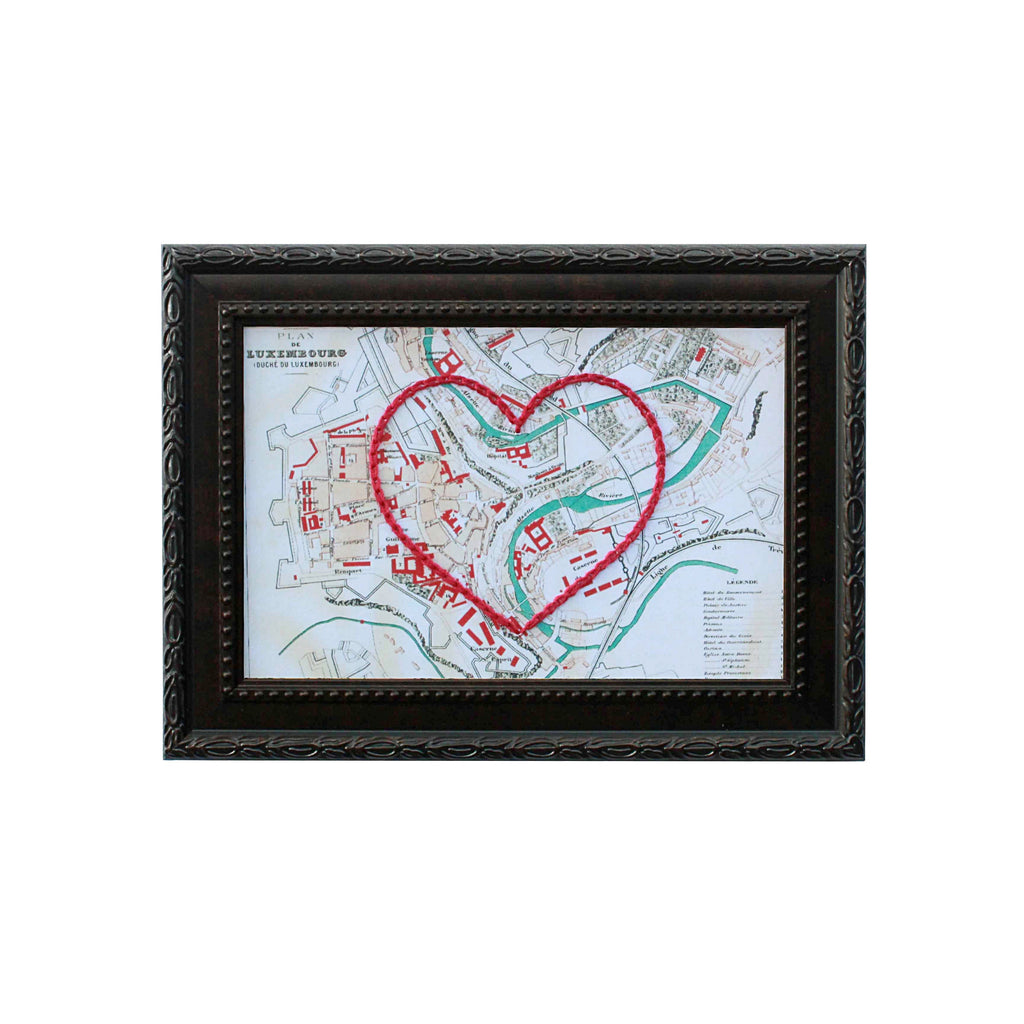 This vintage Luxembourg map print has been hand-embroidered with a red heart that symbolizes the places, people, and adventures you hold dear.