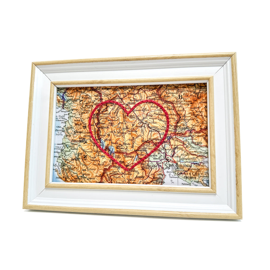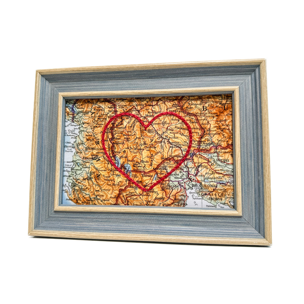 This vintage Macedonia map print has been hand-embroidered with a red heart that symbolizes the places, people, and adventures you hold dear.