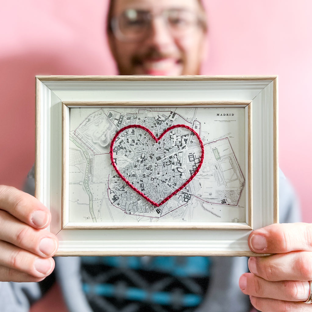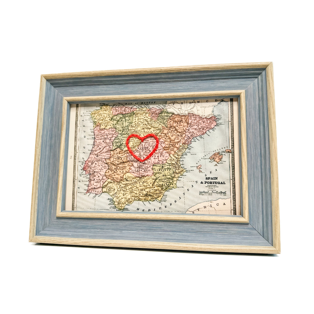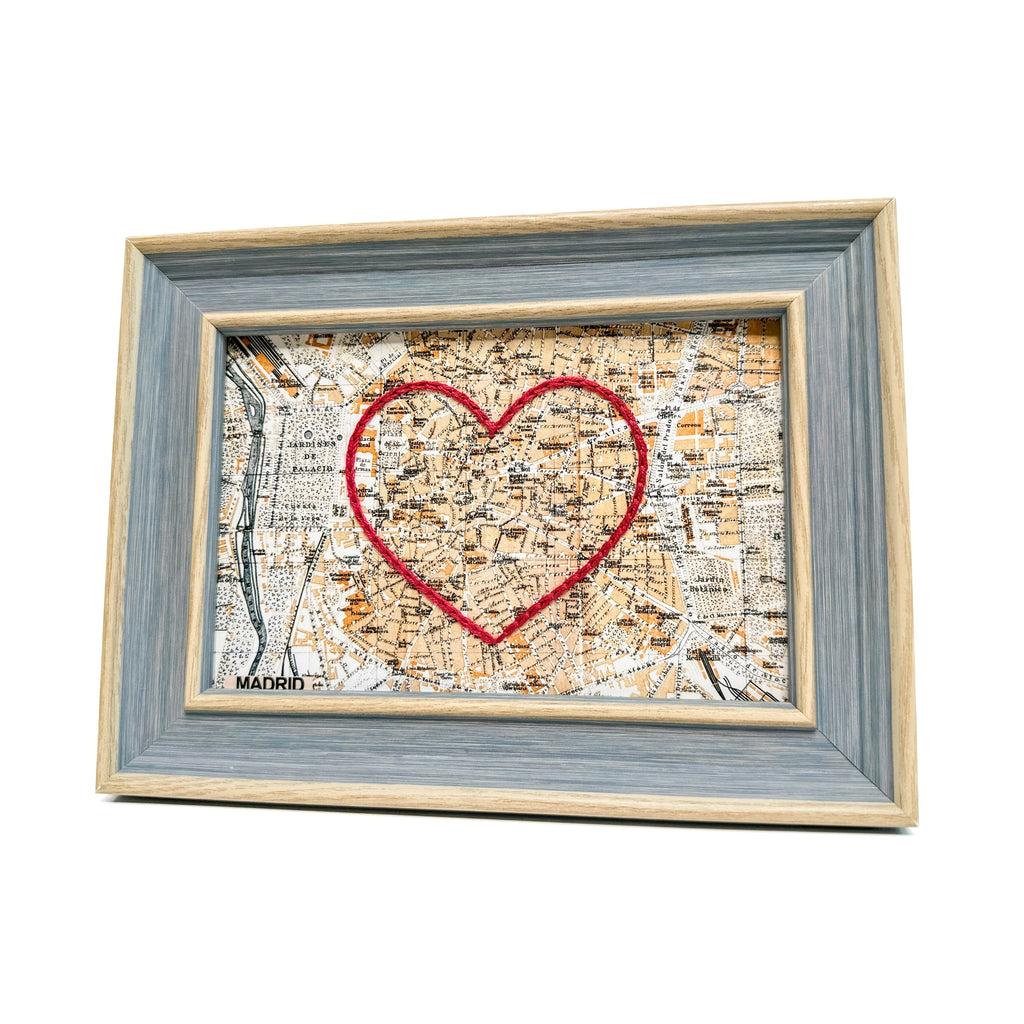 This vintage Madrid, Spain map print has been hand-embroidered with a red heart that symbolizes the places, people, and adventures you hold dear.