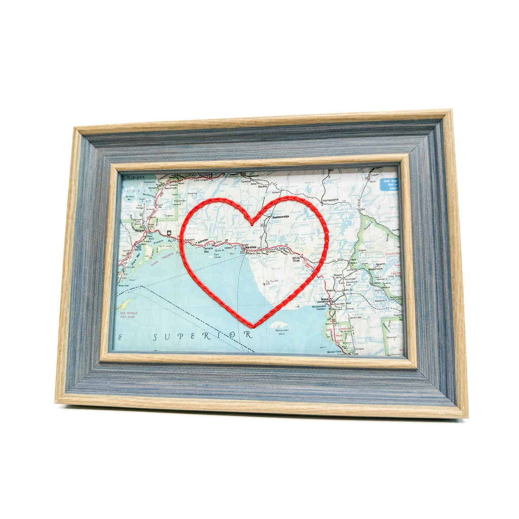 This vintage Marathon, Ontario map print has been hand-embroidered with a red heart - symbolizing the places, people, and adventures you hold dear.