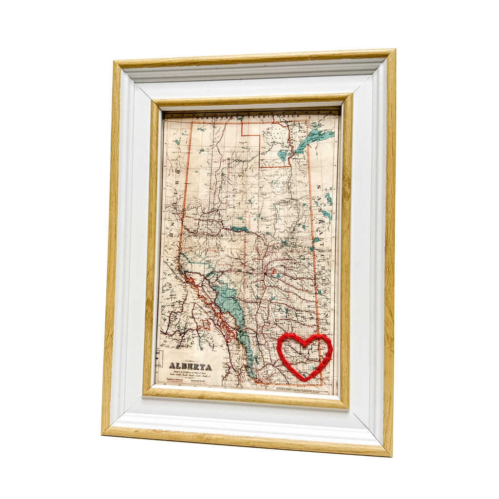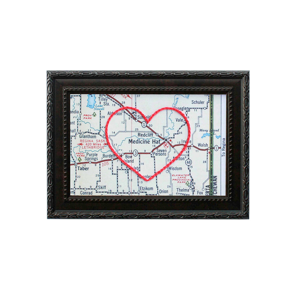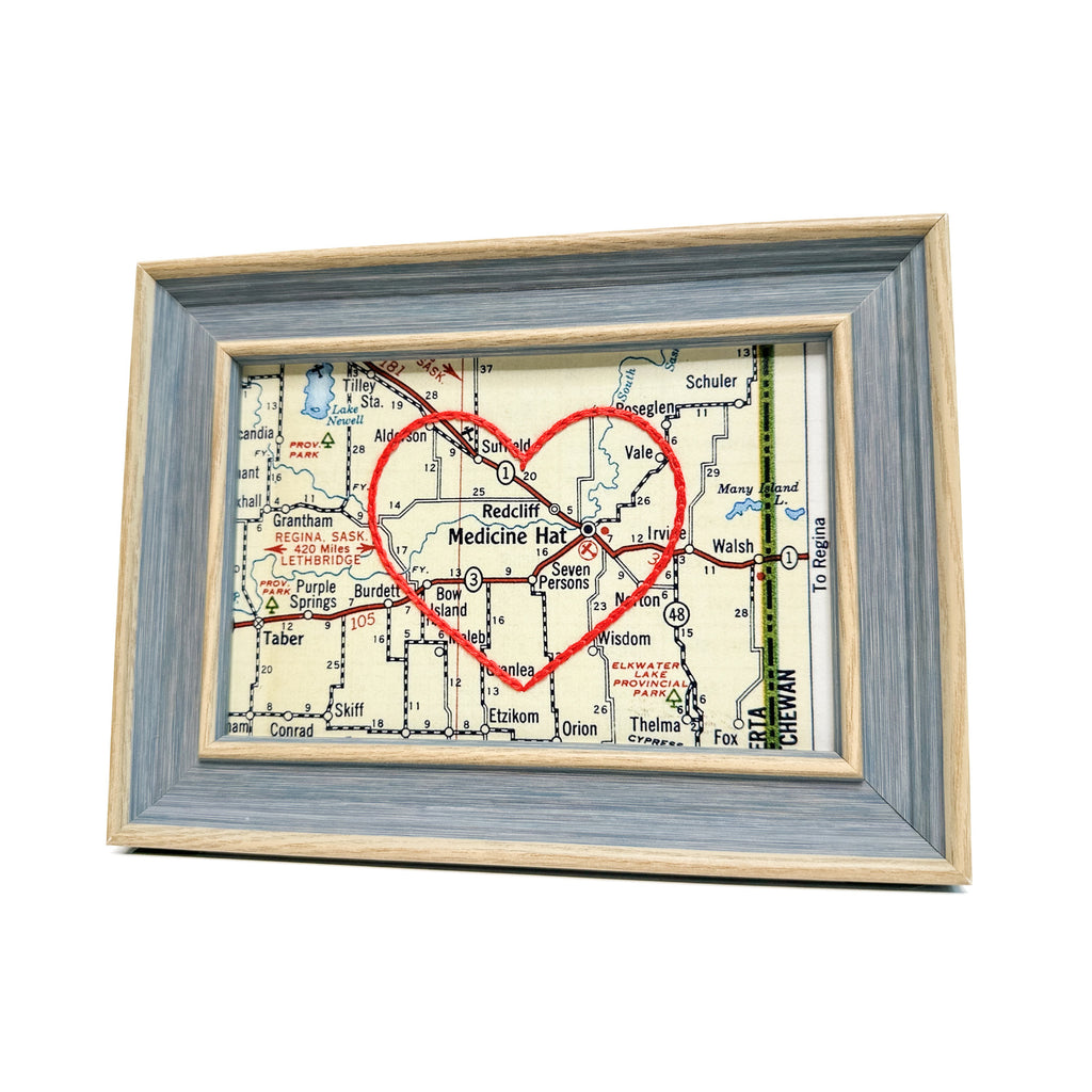 This vintage Medicine Hat, Alberta map print has been hand-embroidered with a red heart that symbolizes the places, people, and adventures you hold dear.