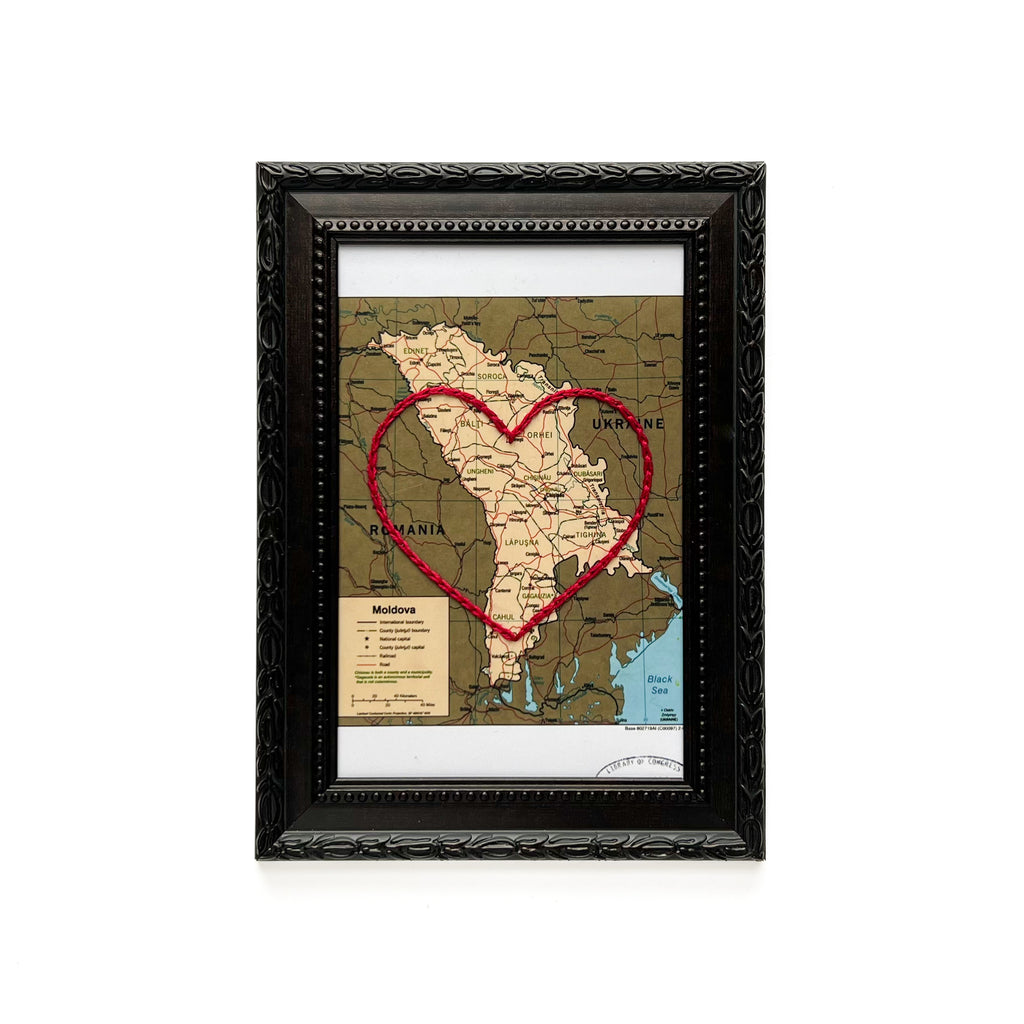 This vintage Moldova map print has been hand-embroidered with a red heart that symbolizes the places, people, and adventures you hold dear.