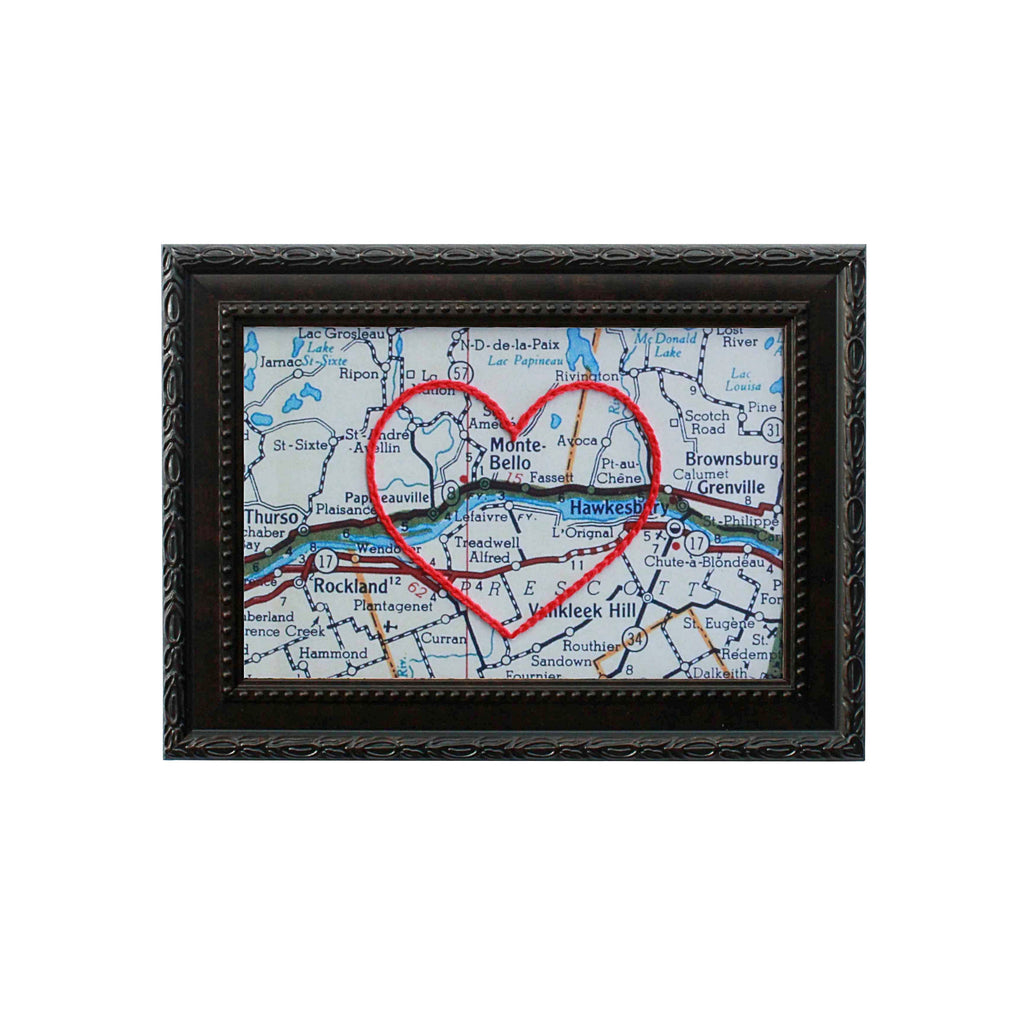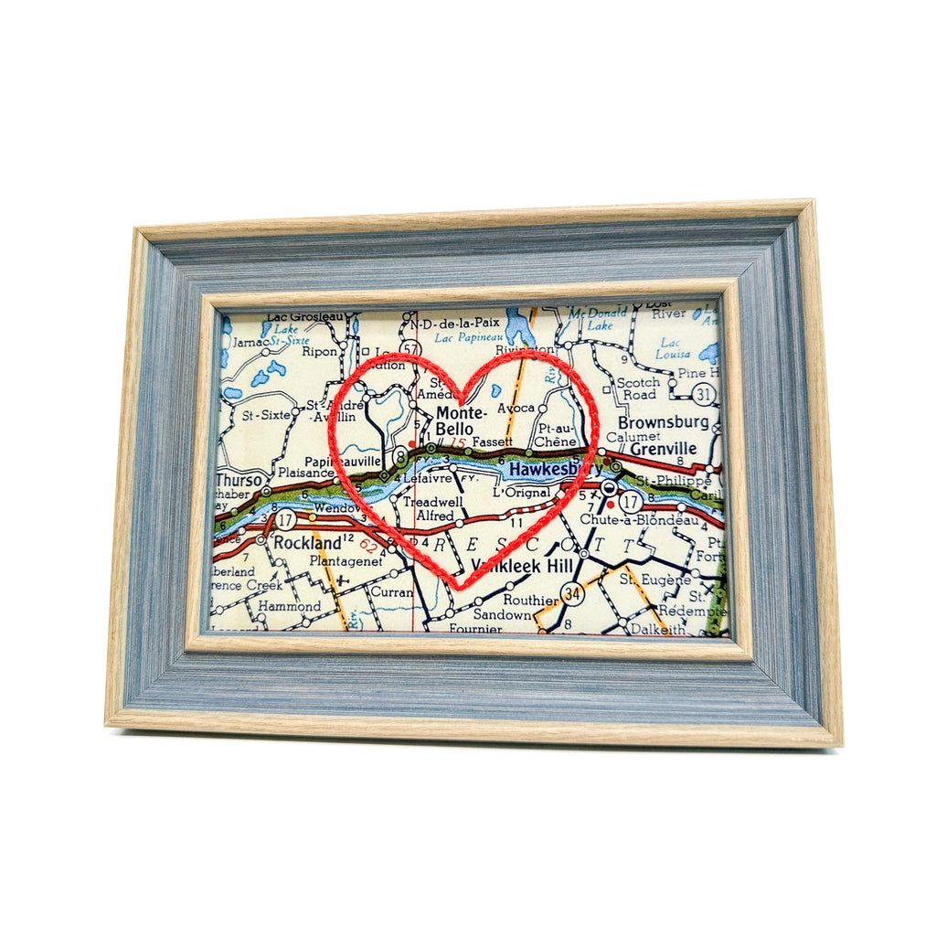 This vintage Montebello, Quebec map print has been hand-embroidered with a red heart that symbolizes the places, people, and adventures you hold dear.
