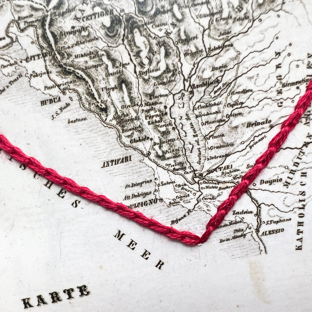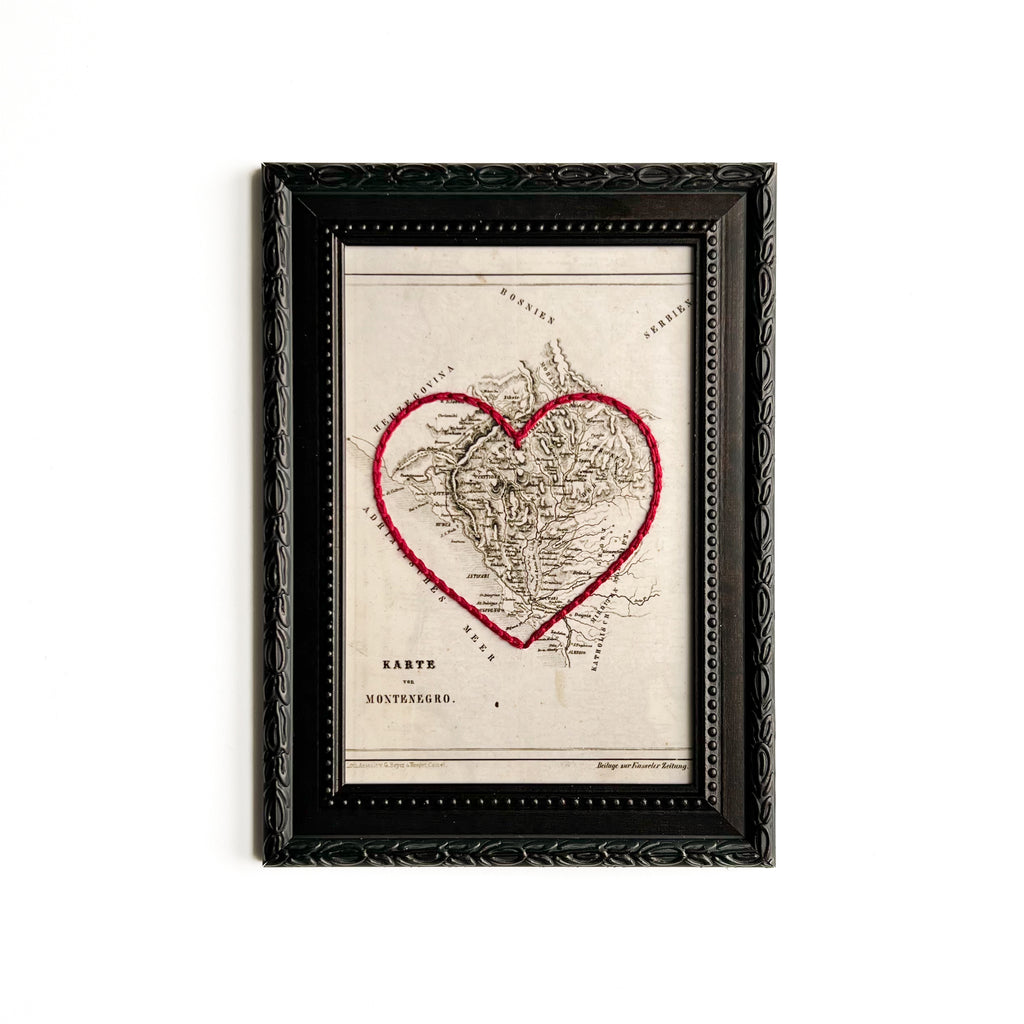 This vintage Montenegro map print has been hand-embroidered with a red heart that symbolizes the places, people, and adventures you hold dear.