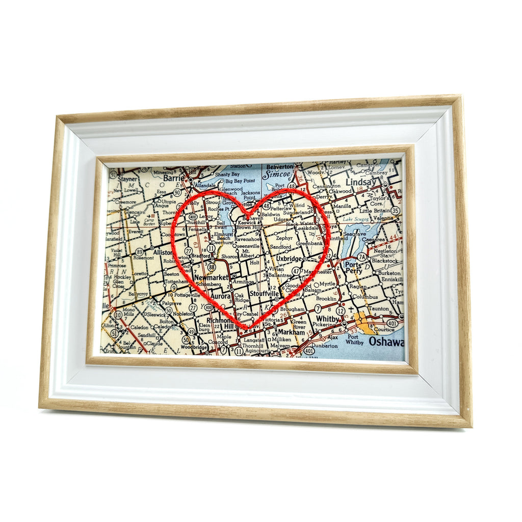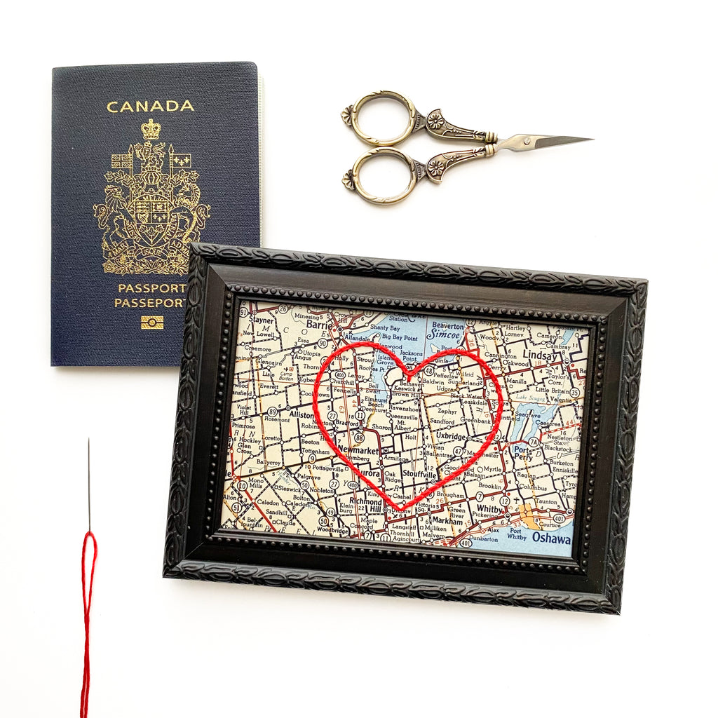 This vintage Mount Albert, Ontario map print has been hand-embroidered with a red heart that symbolizes the places, people, and adventures you hold dear.