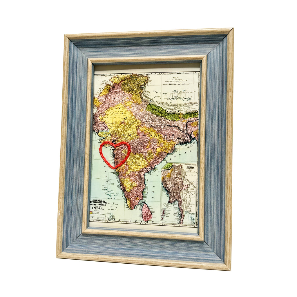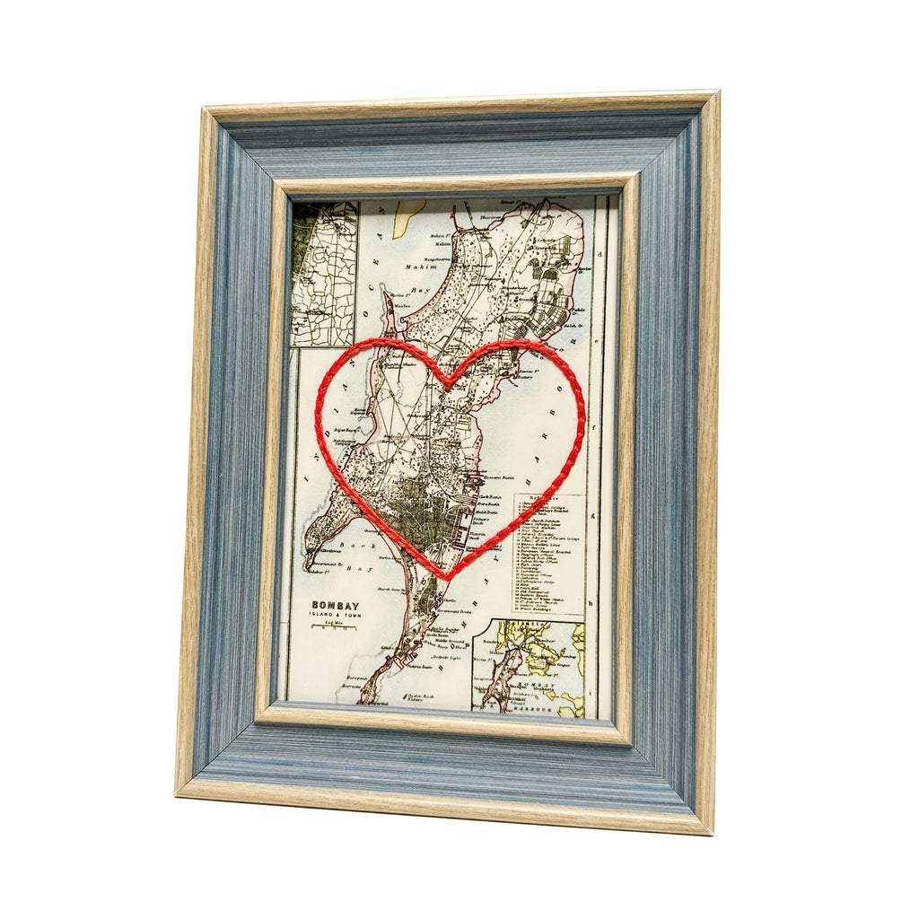 This vintage Mumbai, India map print has been hand-embroidered with a red heart that symbolizes the places, people, and adventures you hold dear.