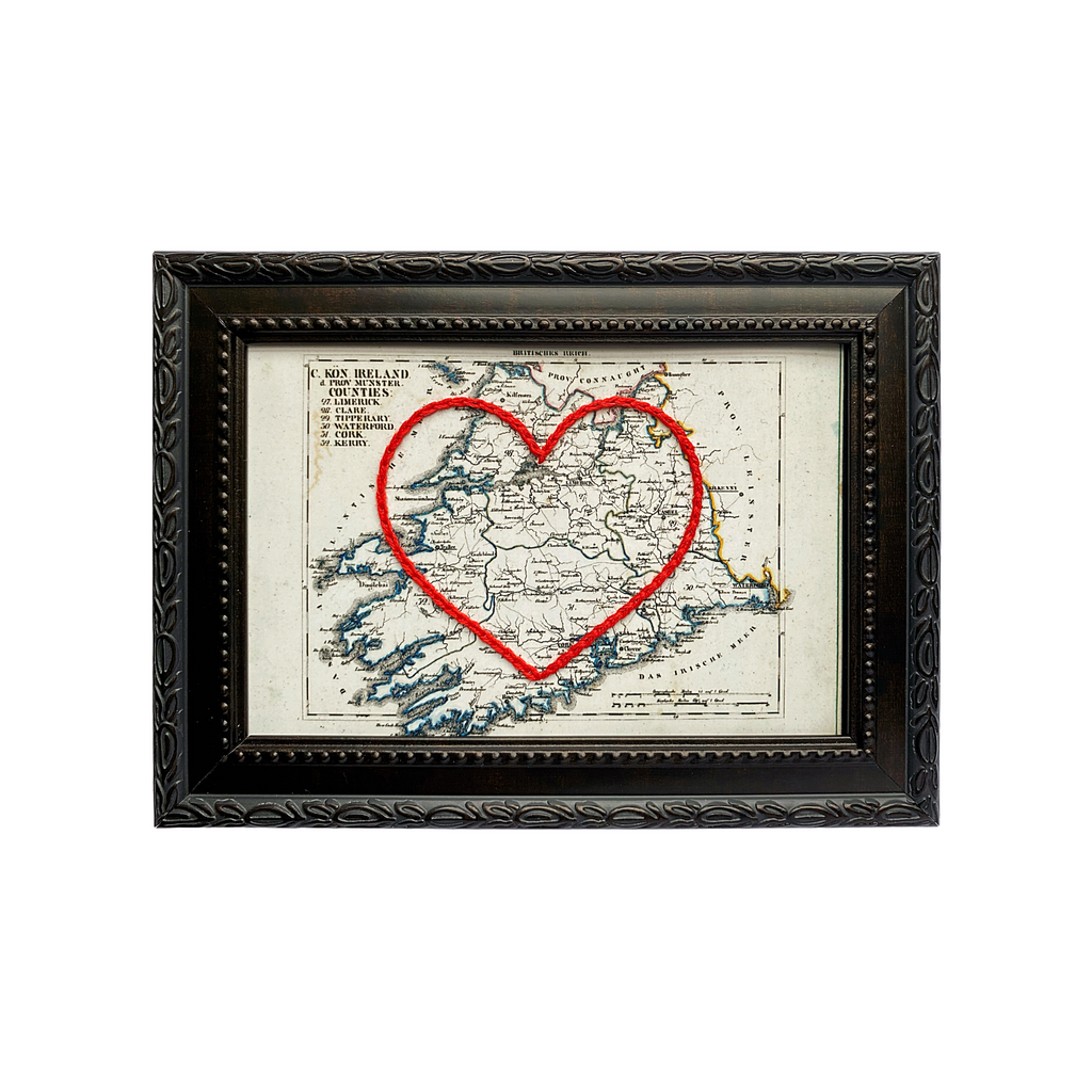 This vintage Munster, Ireland map print has been hand-embroidered with a red heart that symbolizes the places, people, and adventures you hold dear.