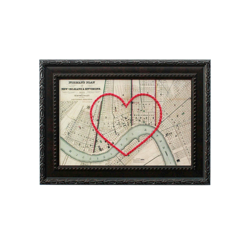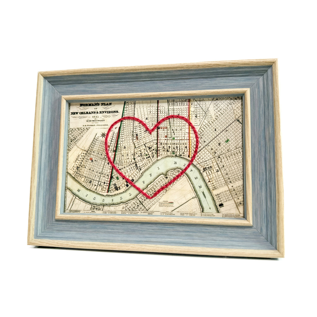 This vintage New Orleans, Louisiana map print has been hand-embroidered with a red heart that symbolizes the places, people, and adventures you hold dear.