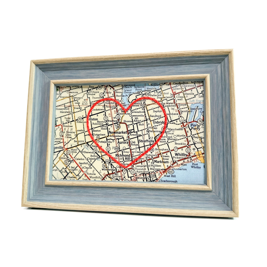 This vintage Newmarket, Ontario map print has been hand-embroidered with a red heart that symbolizes the places, people, and adventures you hold dear.